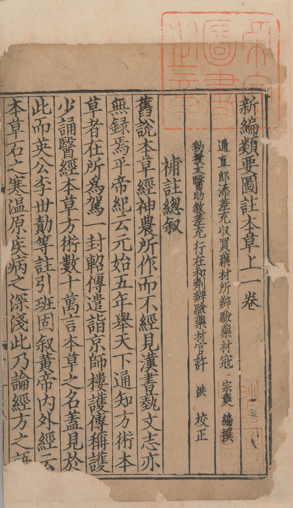 新编类要图注本草. 四十二卷. 目 1 卷. 上 5 卷. 宋唐慎微. 寇宗奭撰. 宋末元初建安余彦国励贤堂刊本