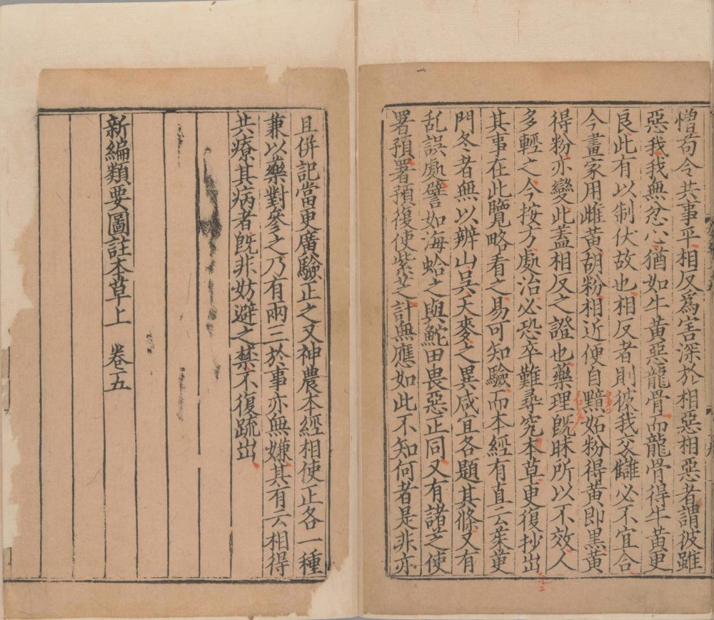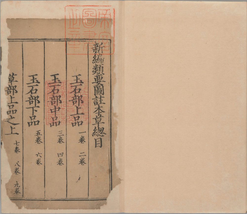 此《新编类要图注本草》是北宋两部重要的本草学著作《大观本草》(唐慎微撰)和《本草衍义》(寇宗奭撰)的删略合编本。全书分四十二卷,目录一卷,序例五卷,分为玉石、草、木、人、兽、禽、虫鱼、果、米谷、菜部。此为日本宫内厅书陵部藏宋末元初建安余彦国励贤堂刊本。