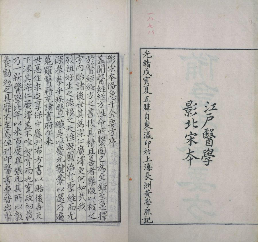 书名背页刻:江戶醫學影北宋本,光緖戊寅夏五購自東瀛,印於上海長洲黃學熙記。