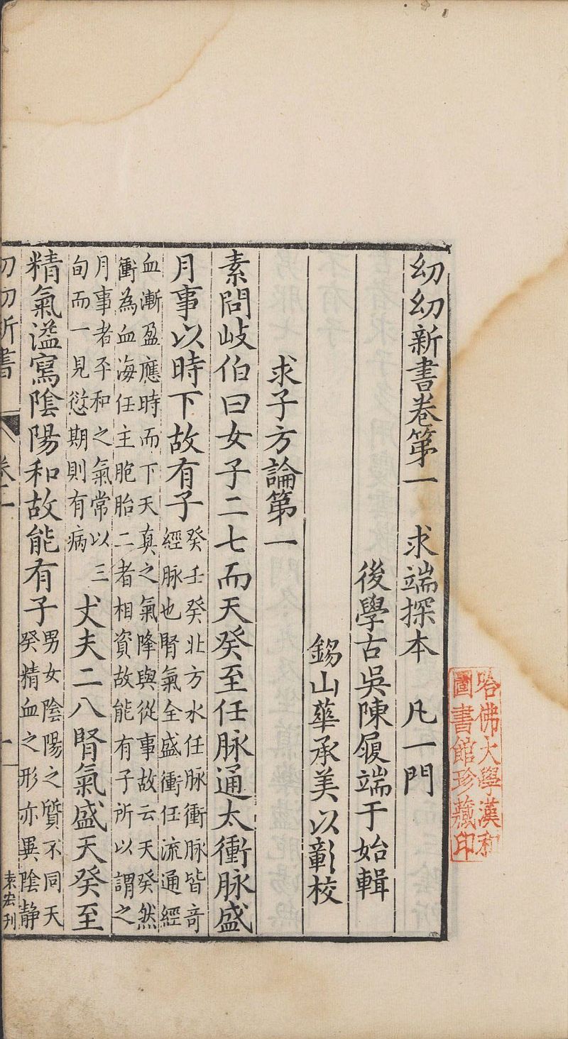 《幼幼新书》是南宋刘昉等辑撰的一部中医儿科类书,汇集了宋以前有关儿科学的成就。此本为明代名儿科医家陈履端重辑,共四十卷,分为五百多门,每门先引前贤之言论其病理病证,后列诸家方药,后附拾遗方一卷。此为明万历十四年古吴陈氏刊本,文内还附宋刻本残一卷。