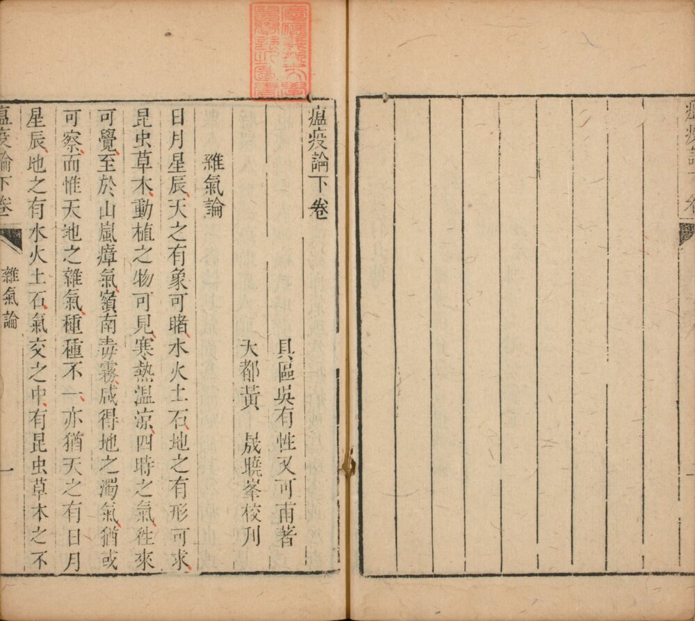 瘟疫论. 上下卷. 附补遗. 明. 吴有性著. 清乾隆时期天都黄晟校刊醒医六书本