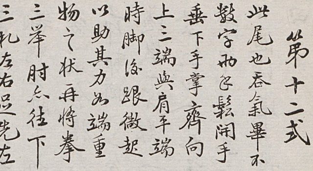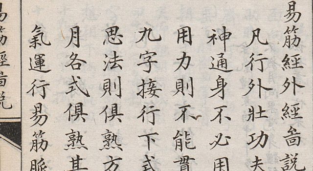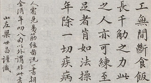 此练力练气运行易筋脉之法也。务须严谨有恒,戒酒色。日夜行五、六、七次,工无间断,食饭四、五顿。专心练习至百日,能长千觔之力,此指少壮者言也。即软弱无力之人,亦可练至五六百斤。倘年老精气不足者,肯如法操练,日行二三次,亦能健食延年,除一切疾病。真神妙也。余气体素弱,中年多病。适于友人处见《易筋经图说》一书,朝夕按图练气,不数月间,果觉身体舒畅,诸病全消。年叨八旬以外,谓非此书之功力欤!因志数言,以信来者。山左梁世昌谨识。