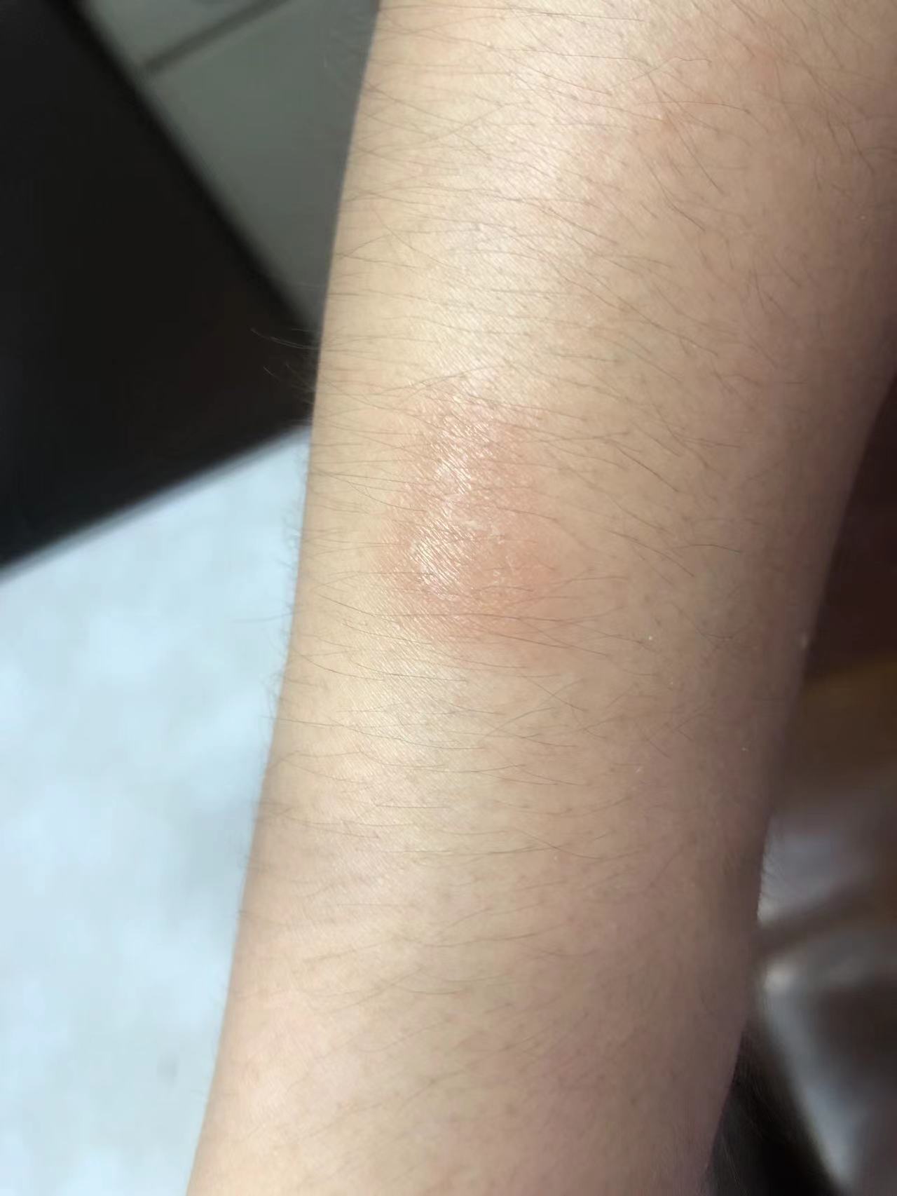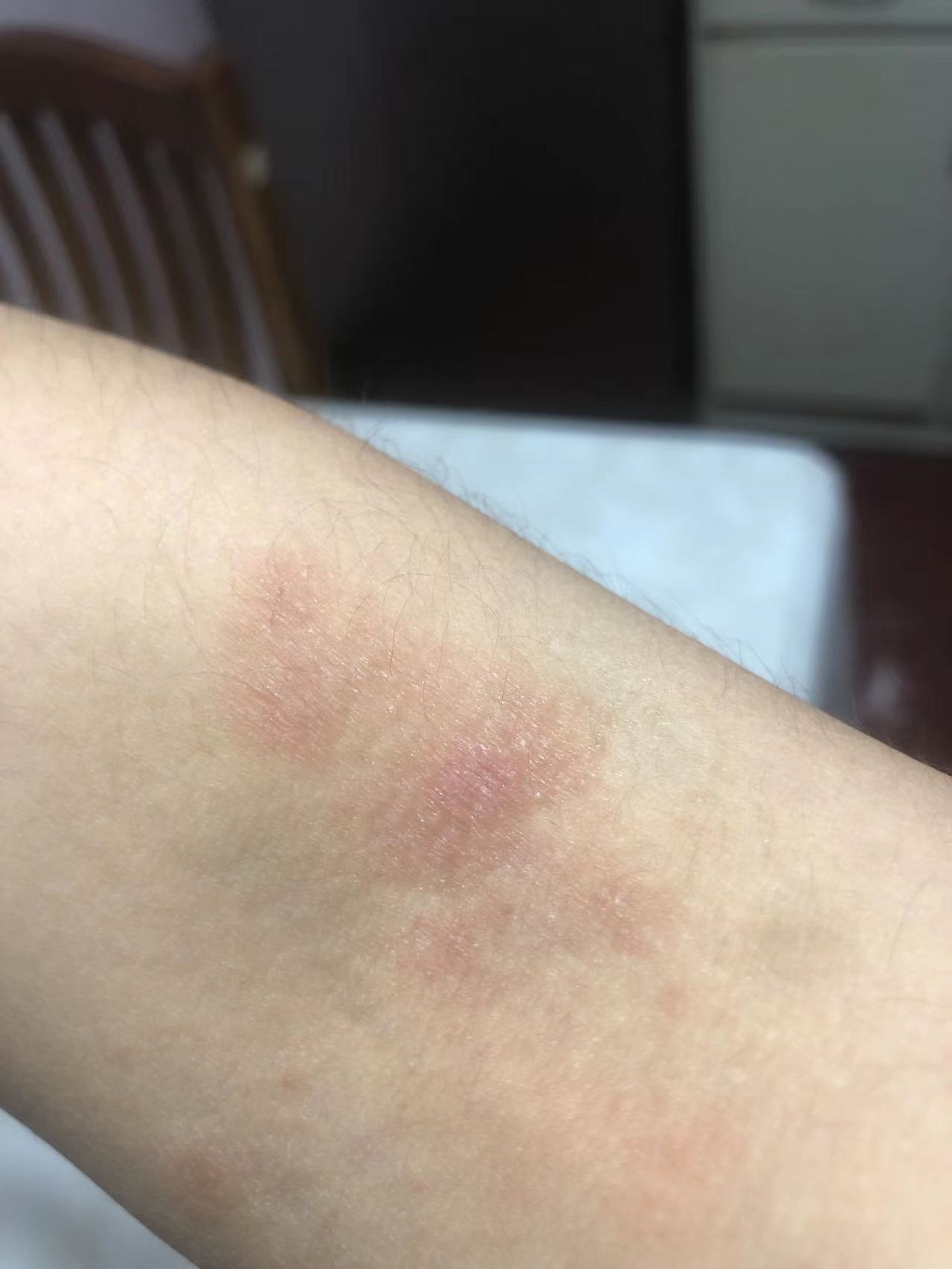 这个感觉好像中毒一样。我一个亲戚,在果树上清理虫子,虫子身上有好多丝,这些丝有毒。后来身上就有和你这个差不多的东西。而且很痒,后来脱了很多皮才好的。具体怎么处理的我不知道。不过有个偏方,允许有用。弄一些盐到瓷杯里面,玻璃杯也可以。然后倒一些纯净水。搅拌后,杯子里面还可以看到固体盐。然后,用棉签蘸水擦拭红斑处。