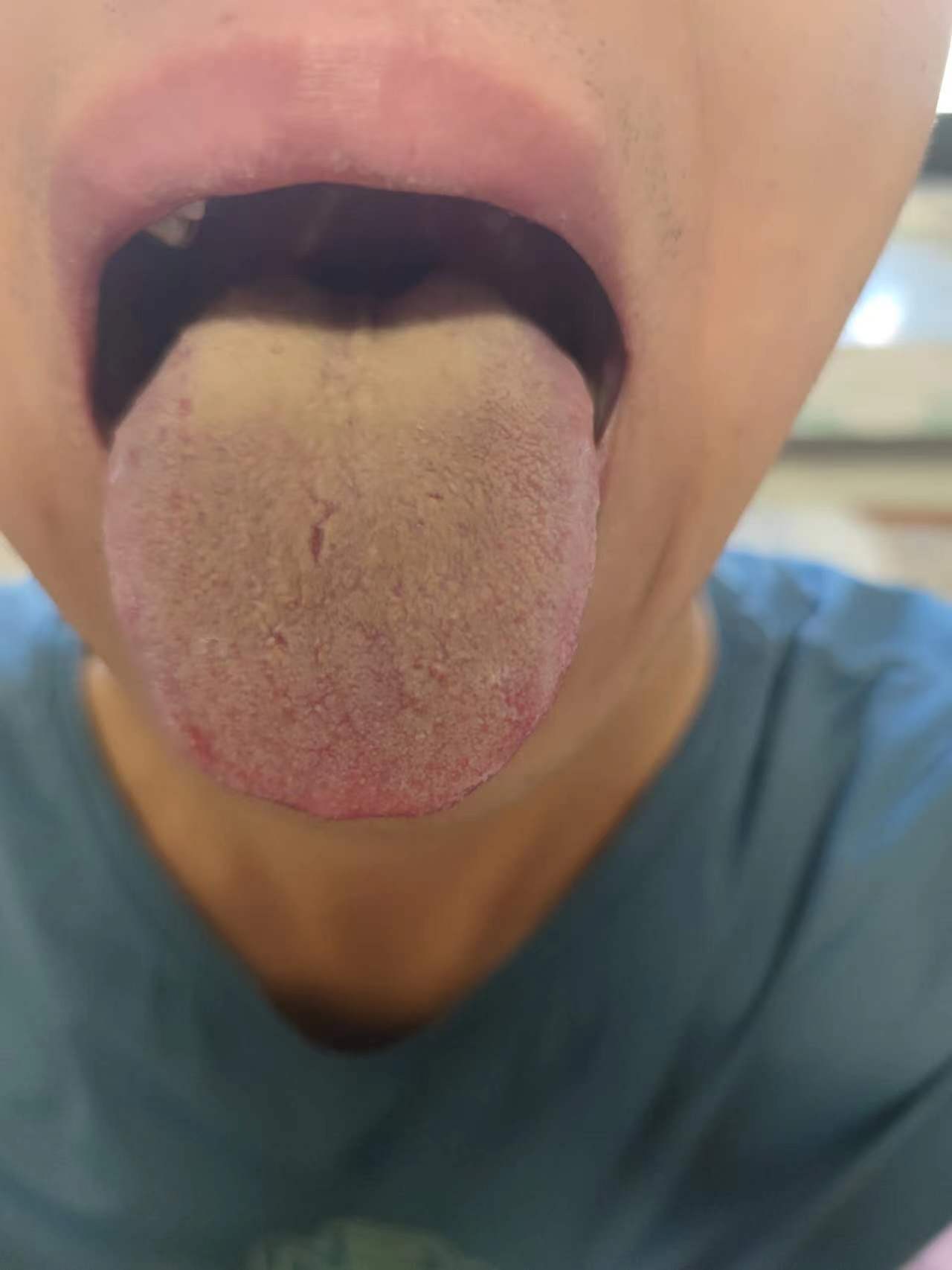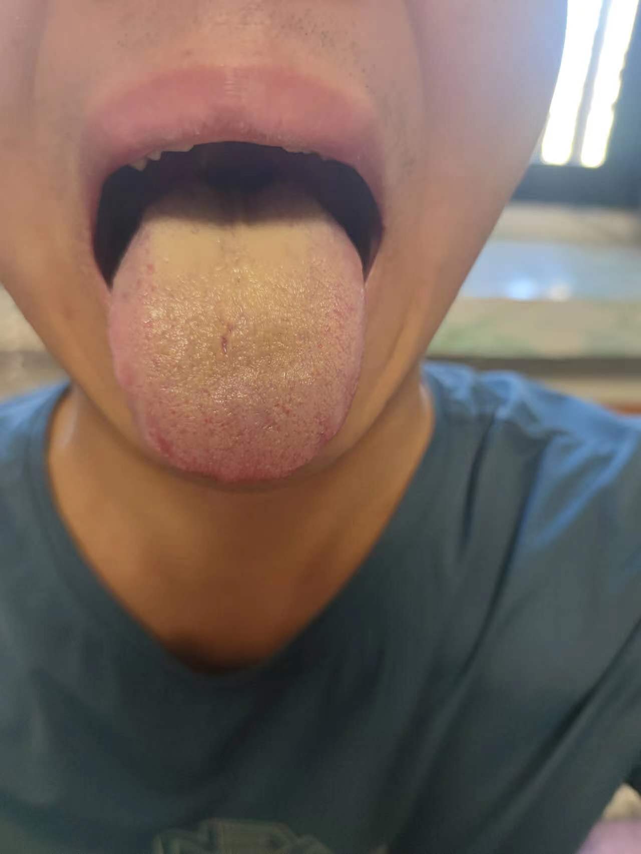 整个舌头的舌苔都黄厚腻,尤其是中部和根部,舌尖红略带瘀斑,