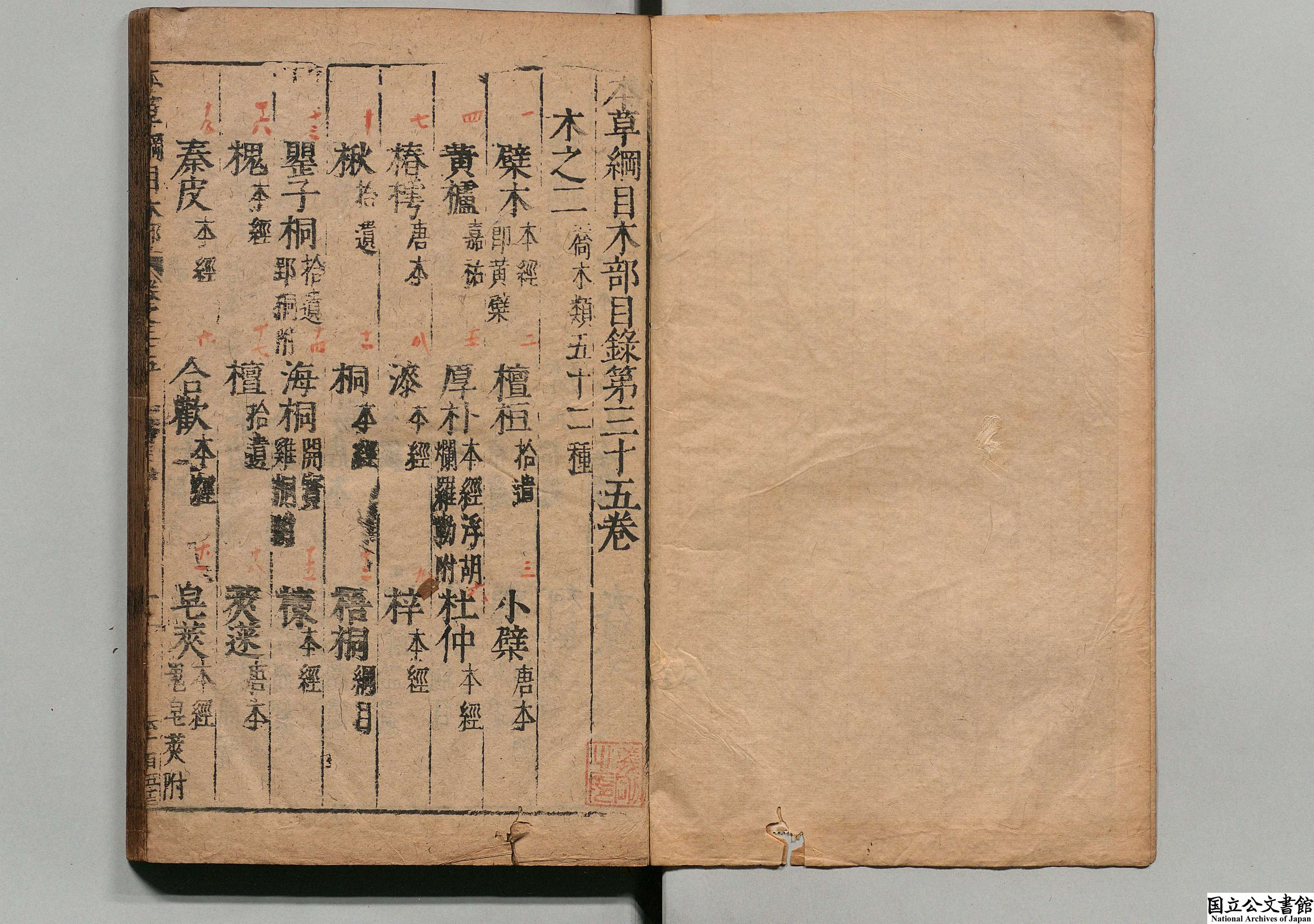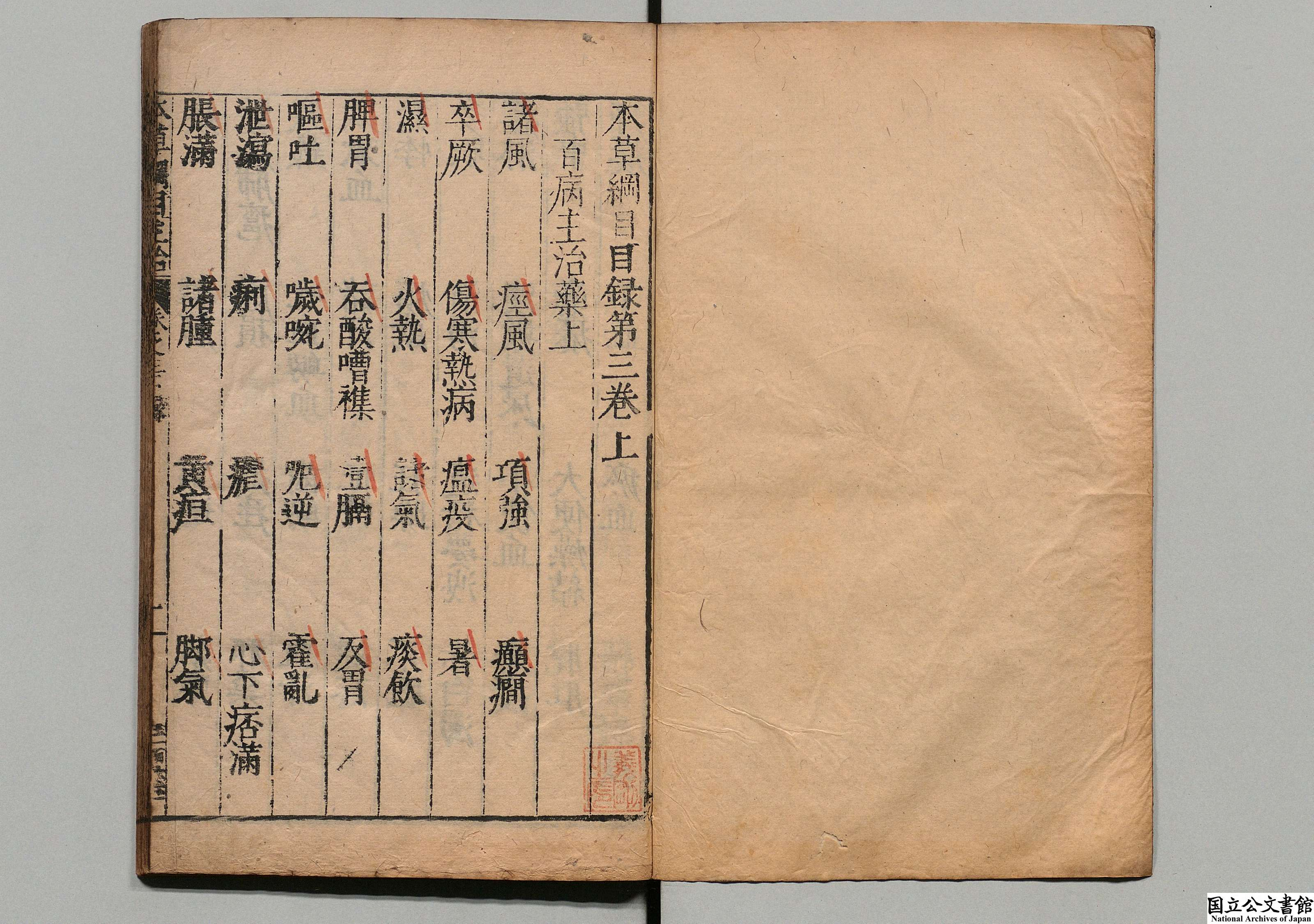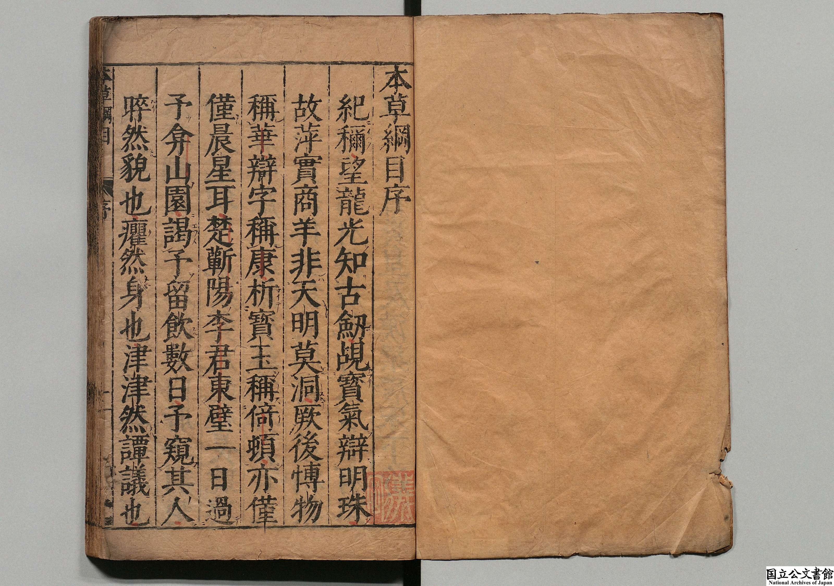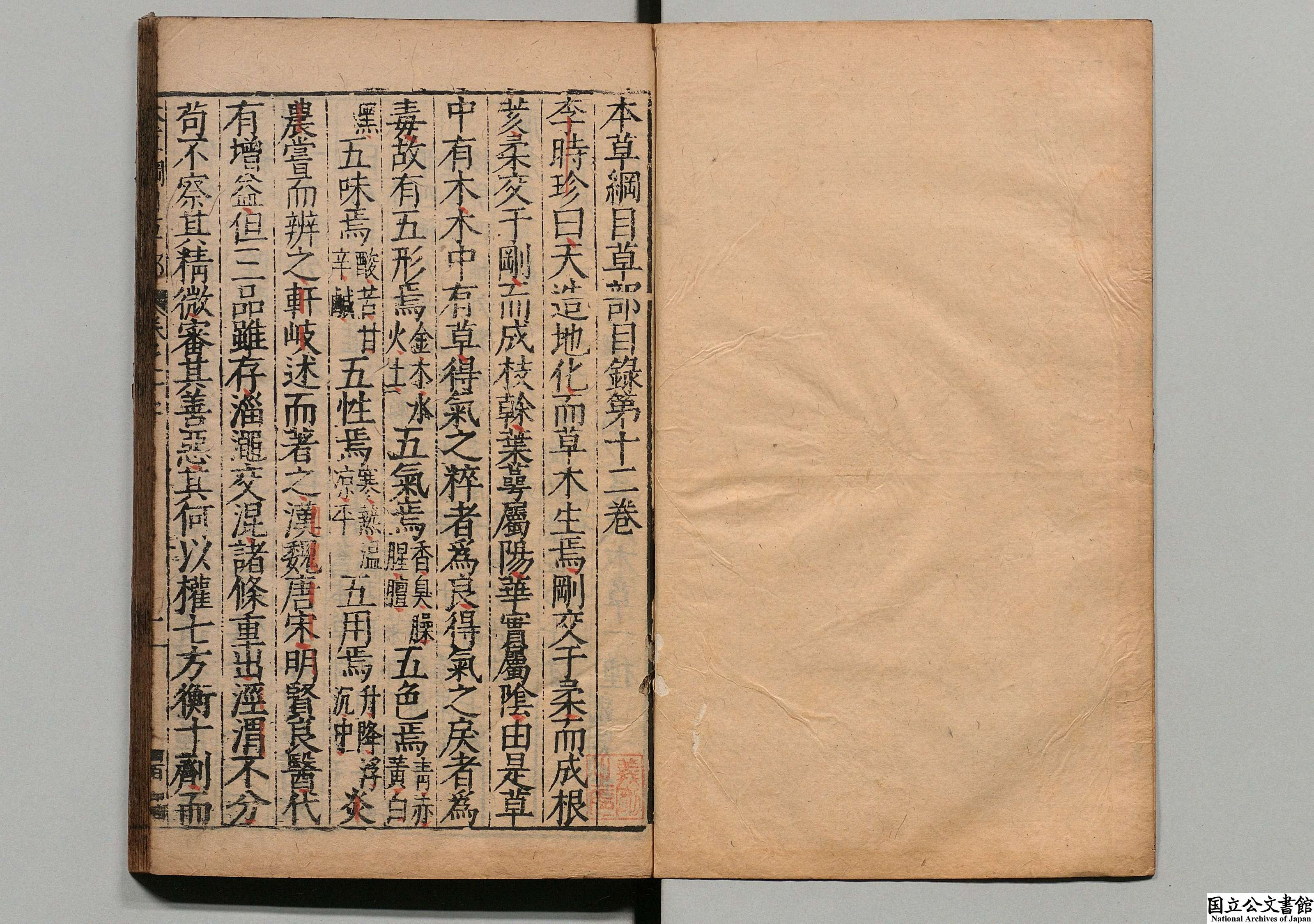 本草纲目 全52卷 另含:图2卷 奇经八脉考 脉学 脉诀考证各1卷 明·李时珍编著 明万历31年 (1603年) 江西本刻本 高积山释迦文院旧藏 日本内阁文库数字化