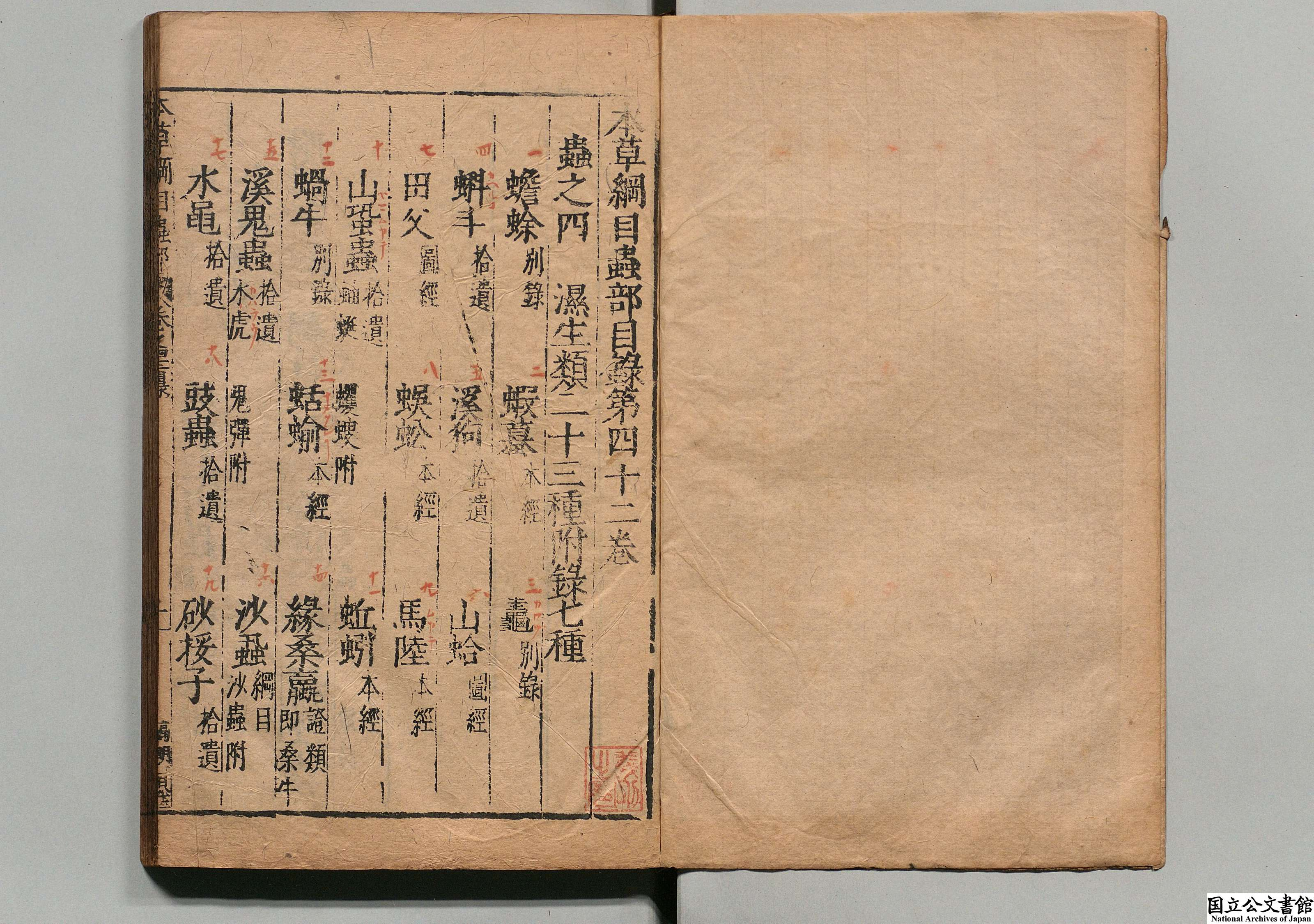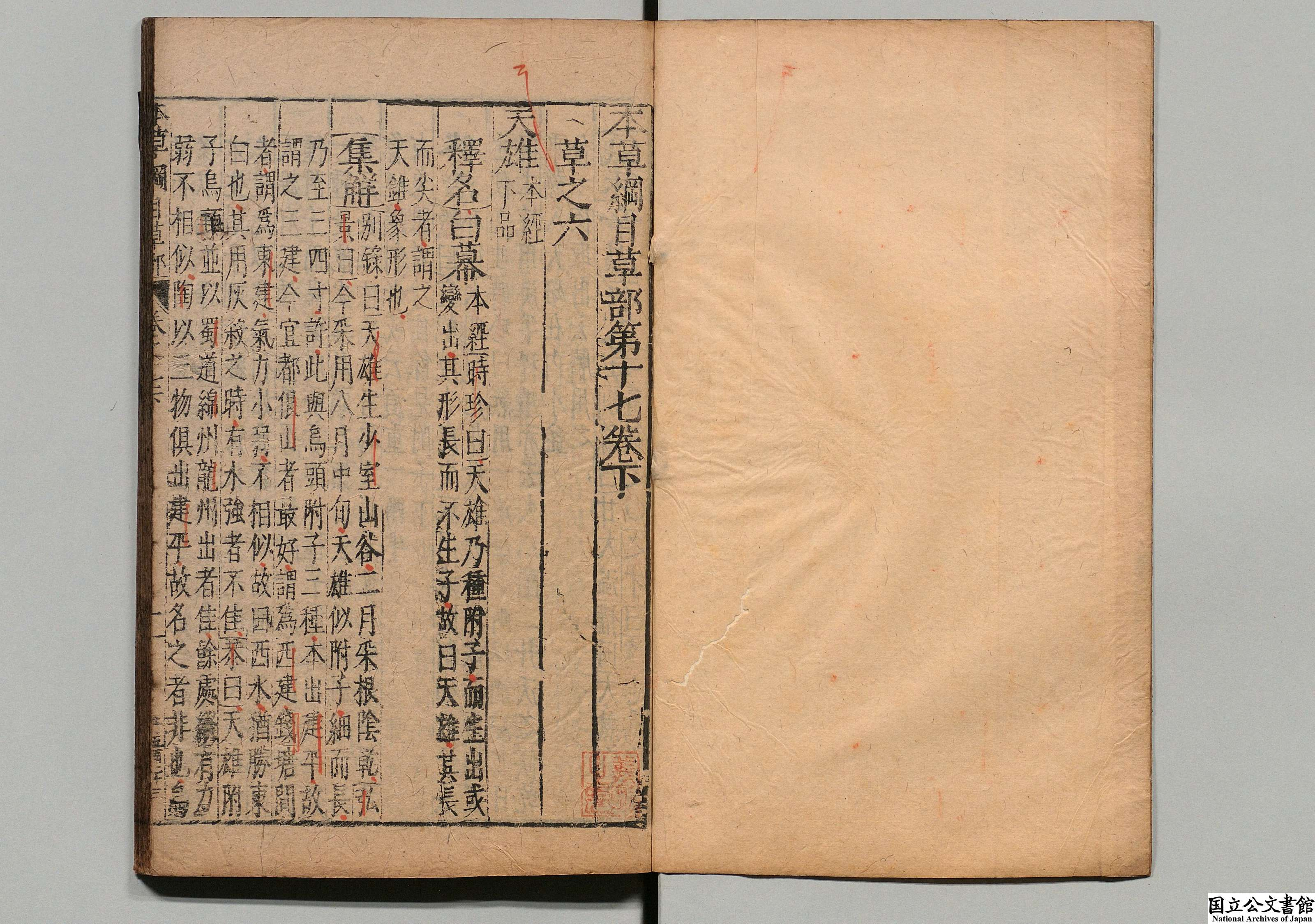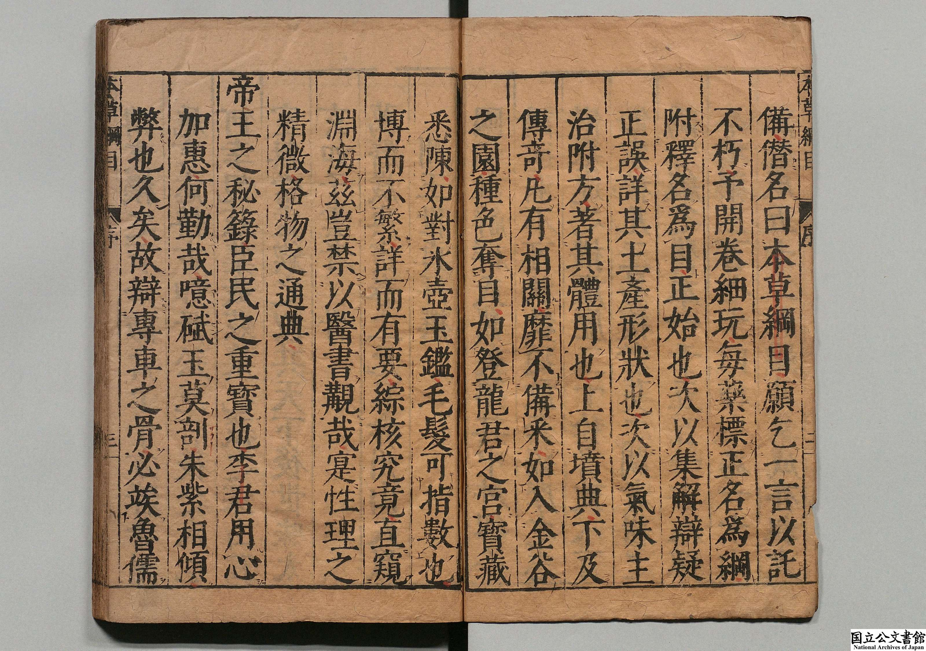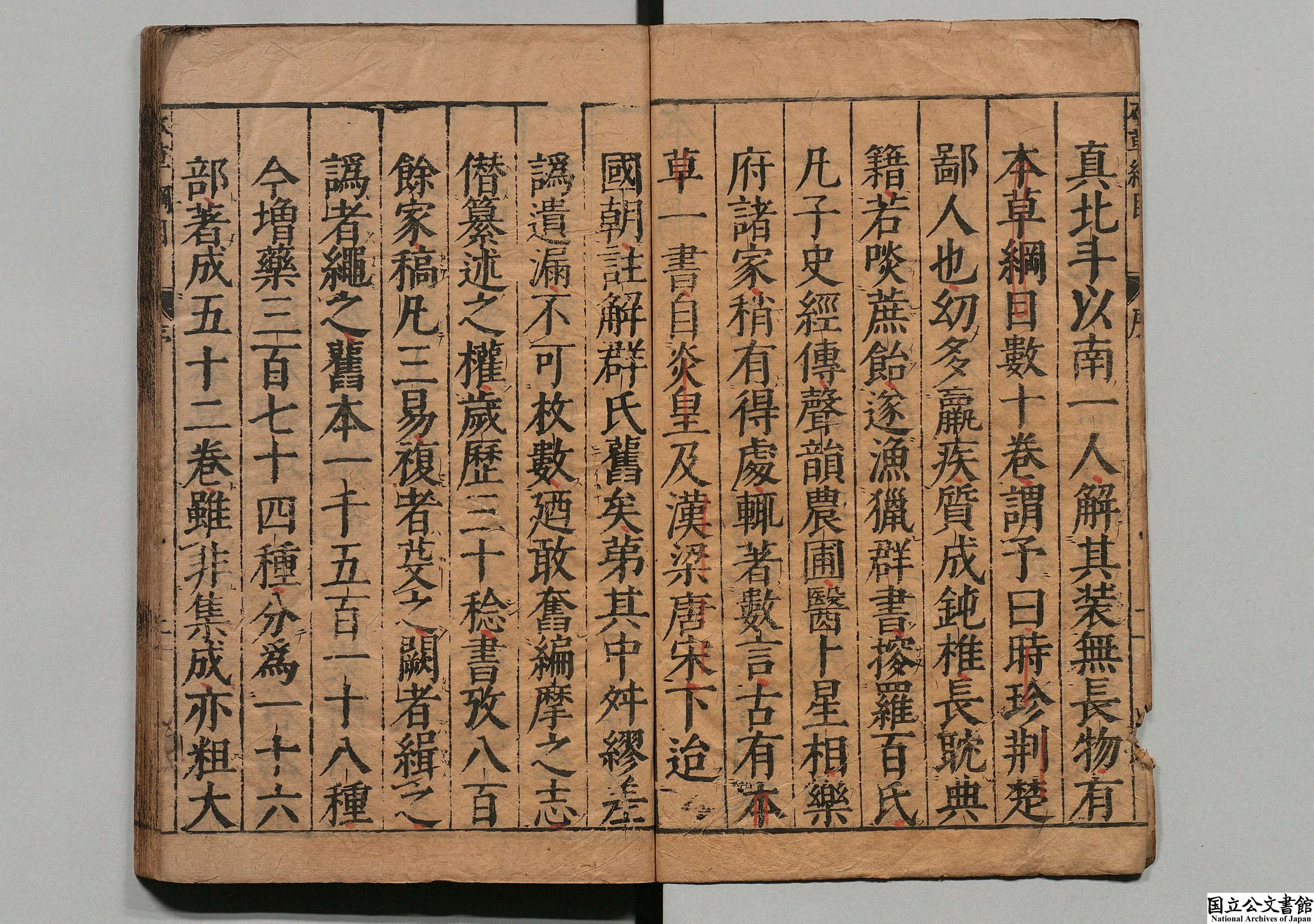 本草纲目 全52卷 另含:图2卷 奇经八脉考 脉学 脉诀考证各1卷 明·李时珍编著 明万历31年 (1603年) 江西本刻本 高积山释迦文院旧藏 日本内阁文库数字化