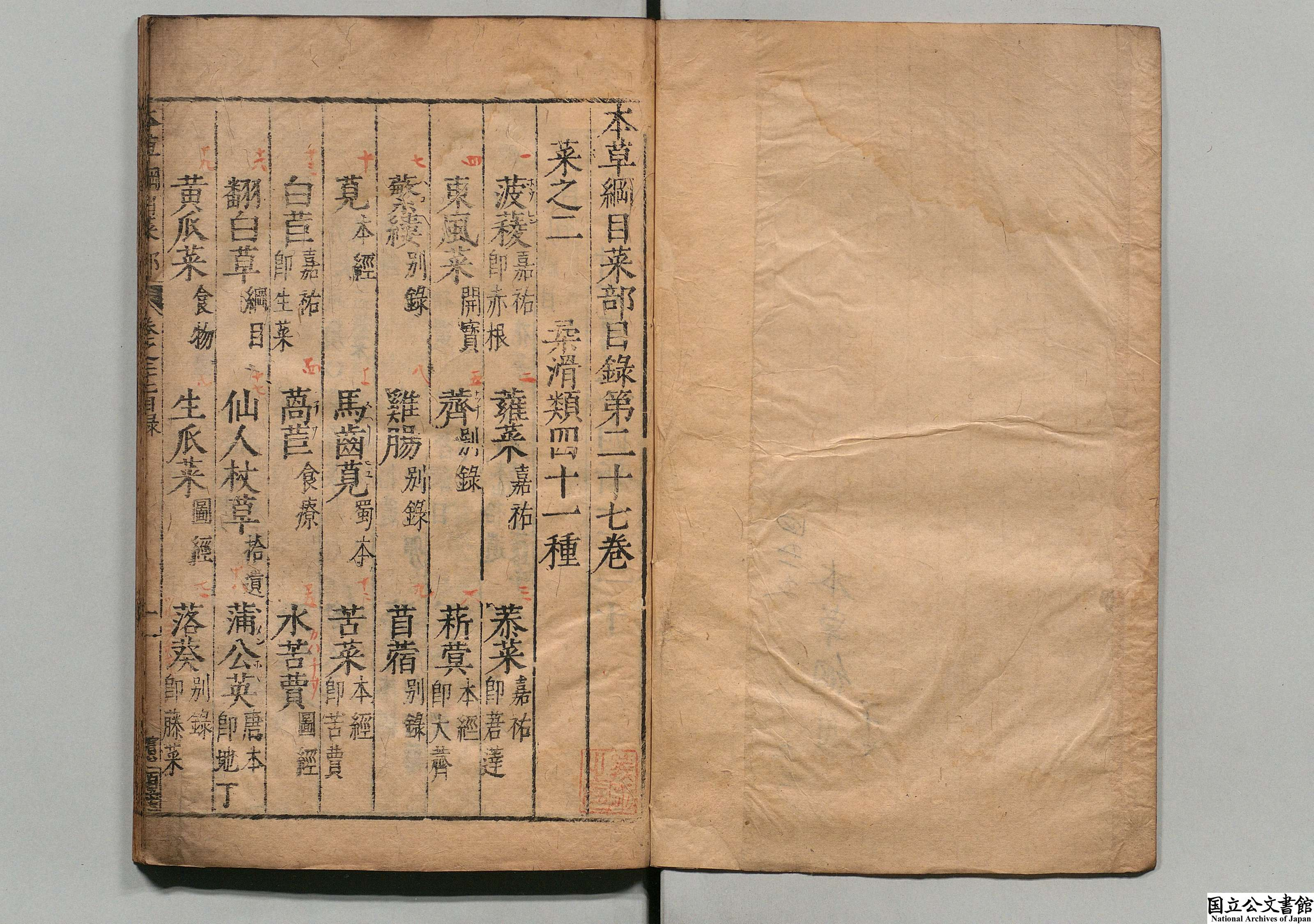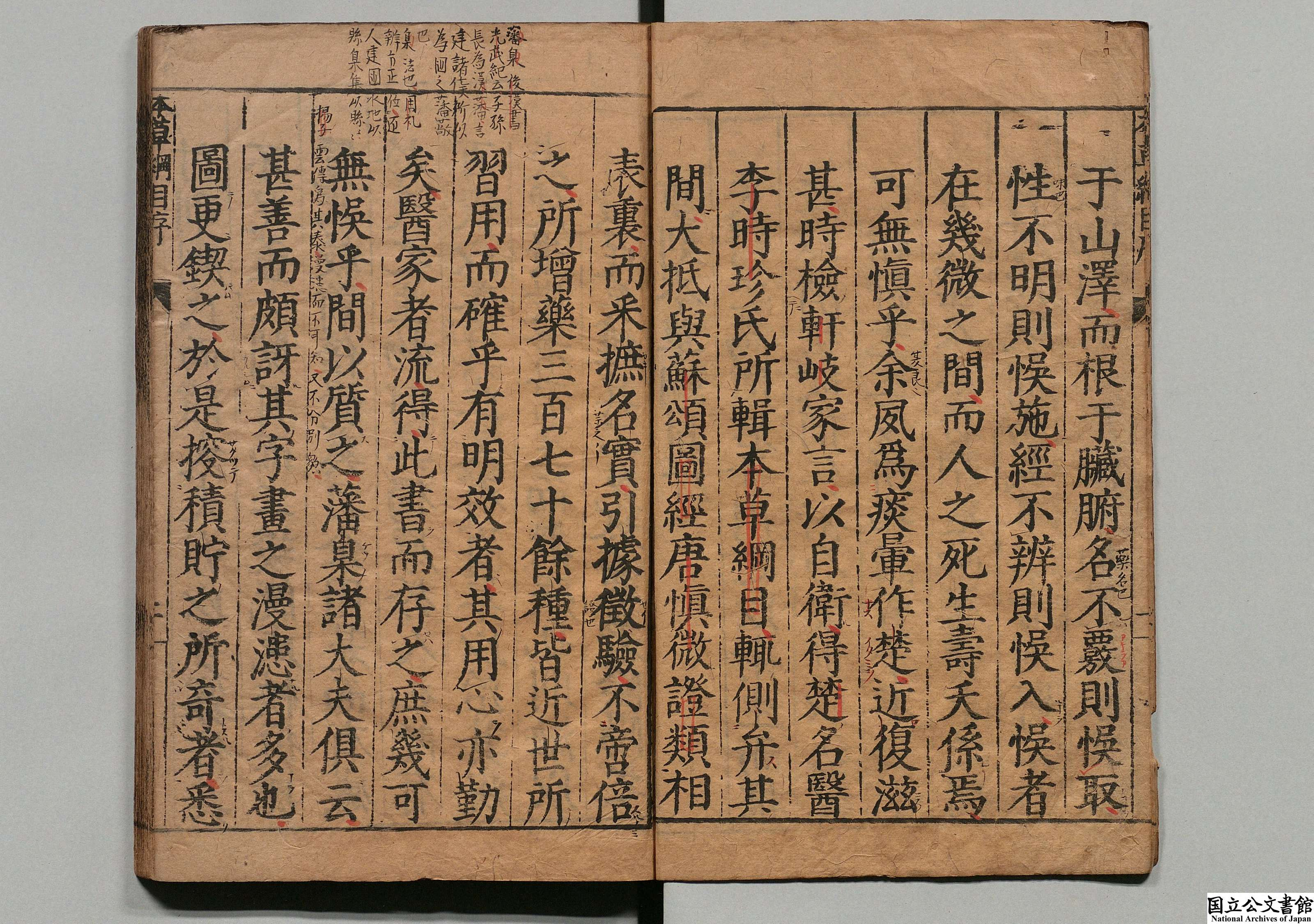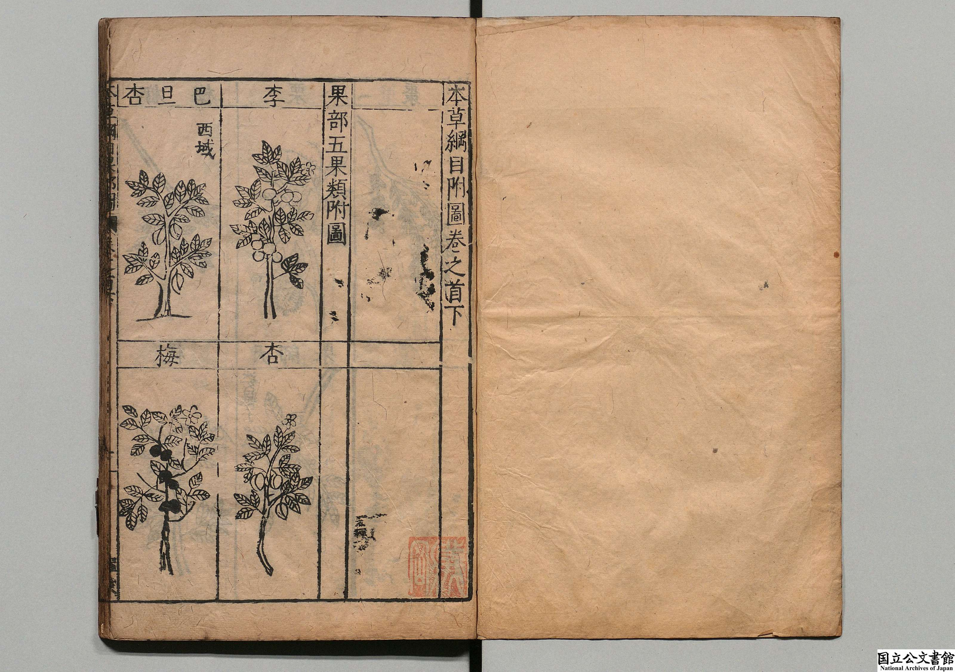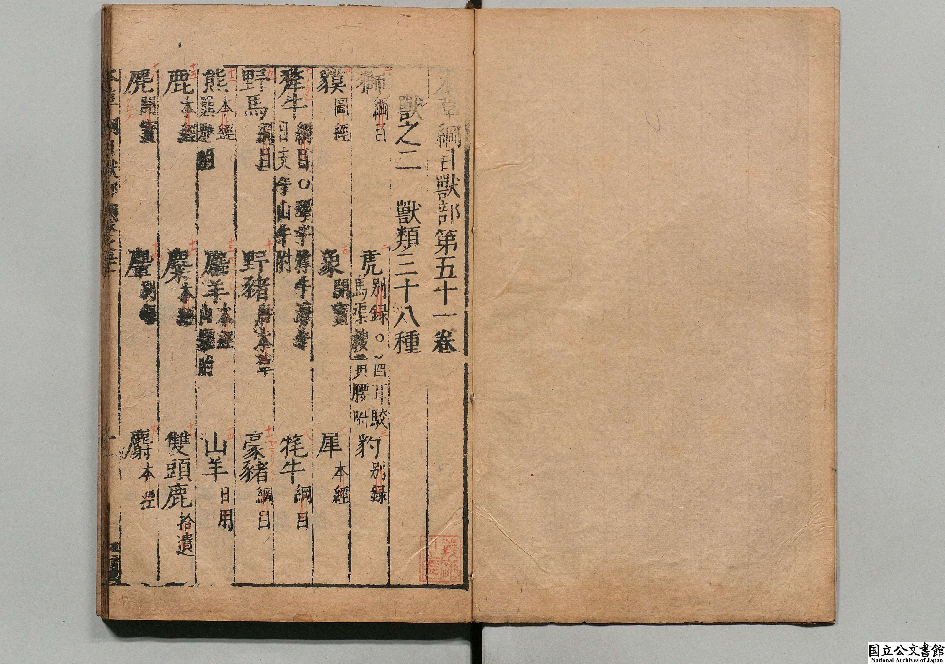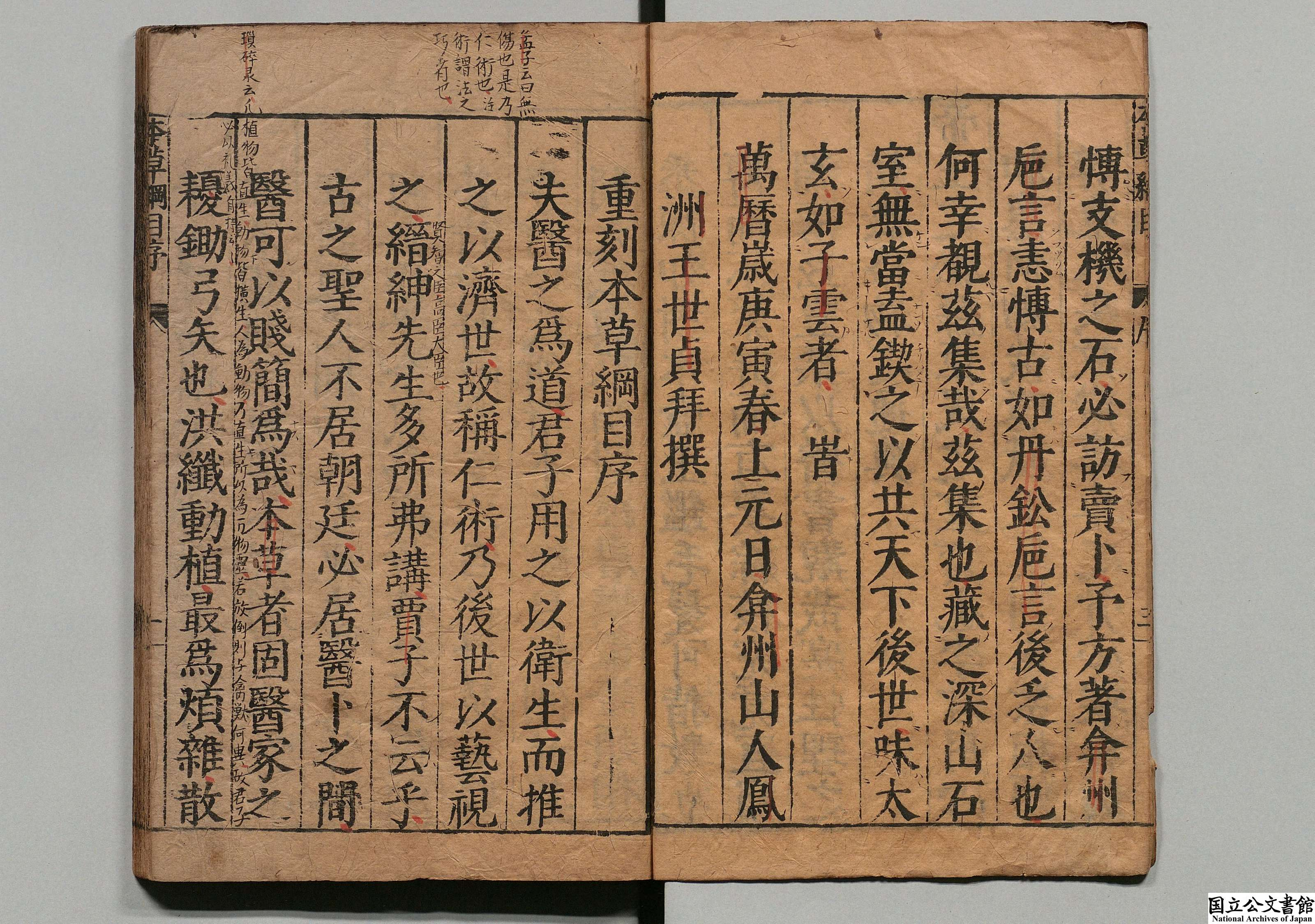 本草纲目 全52卷 另含:图2卷 奇经八脉考 脉学 脉诀考证各1卷 明·李时珍编著 明万历31年 (1603年) 江西本刻本 高积山释迦文院旧藏 日本内阁文库数字化