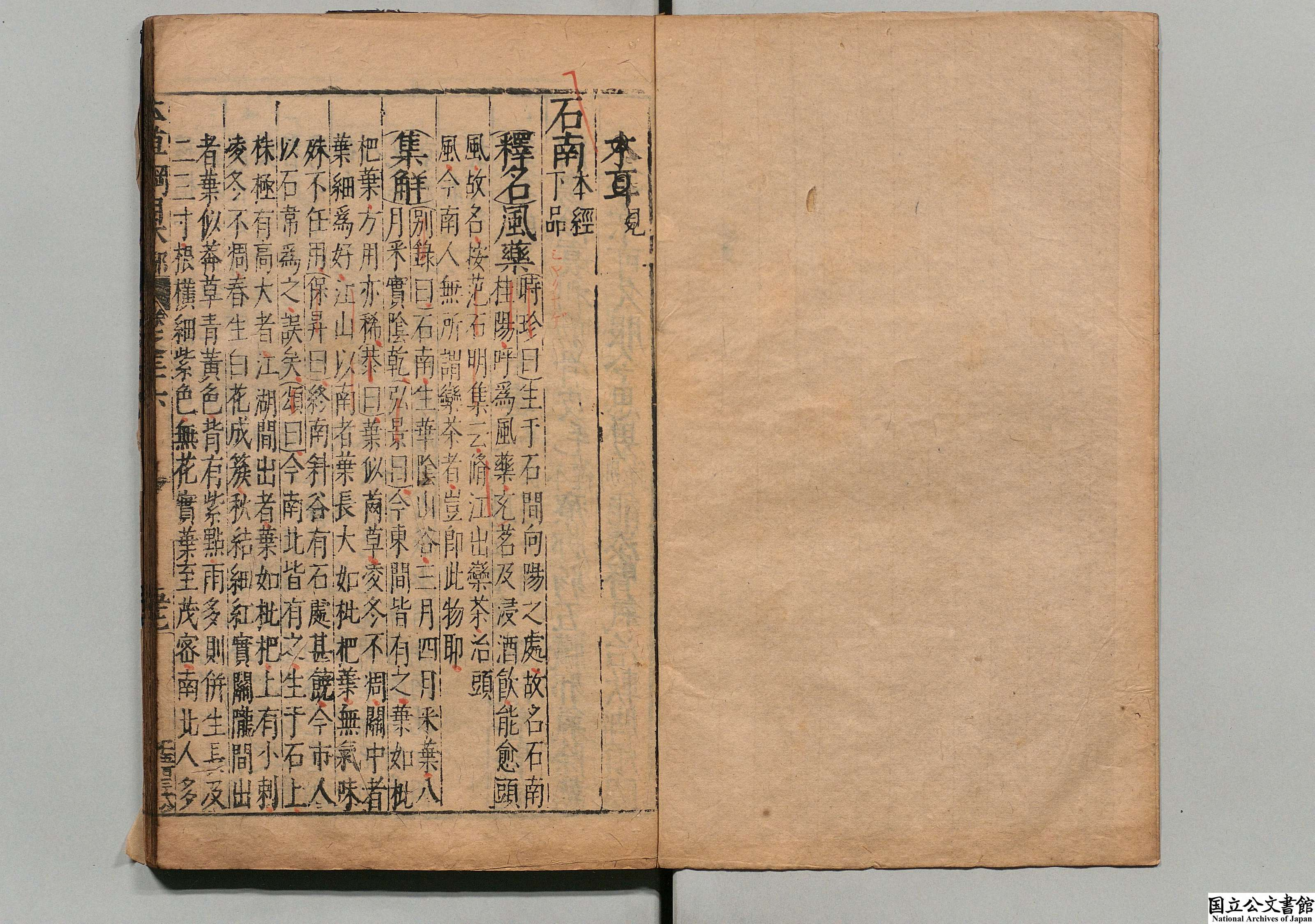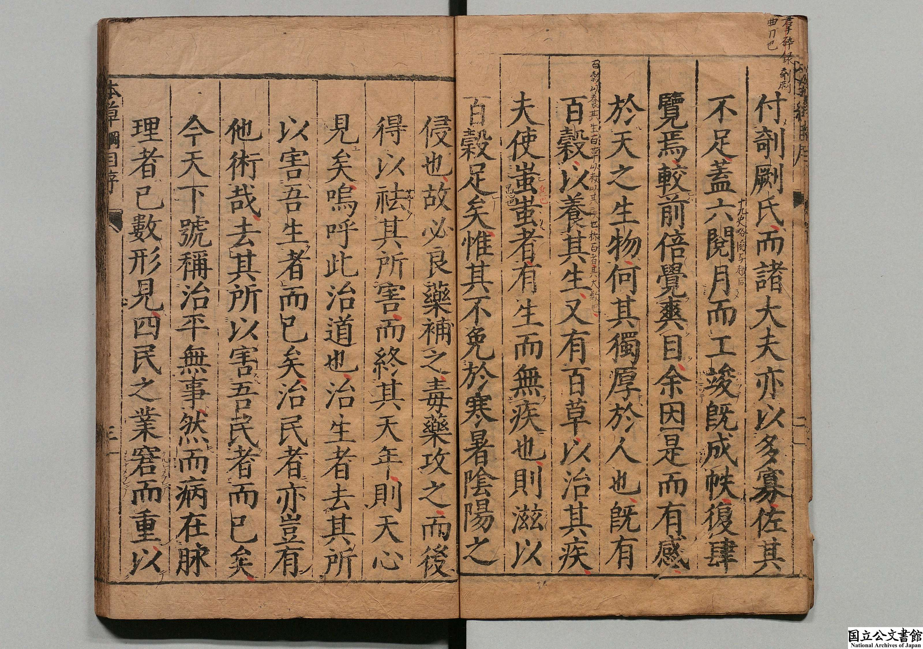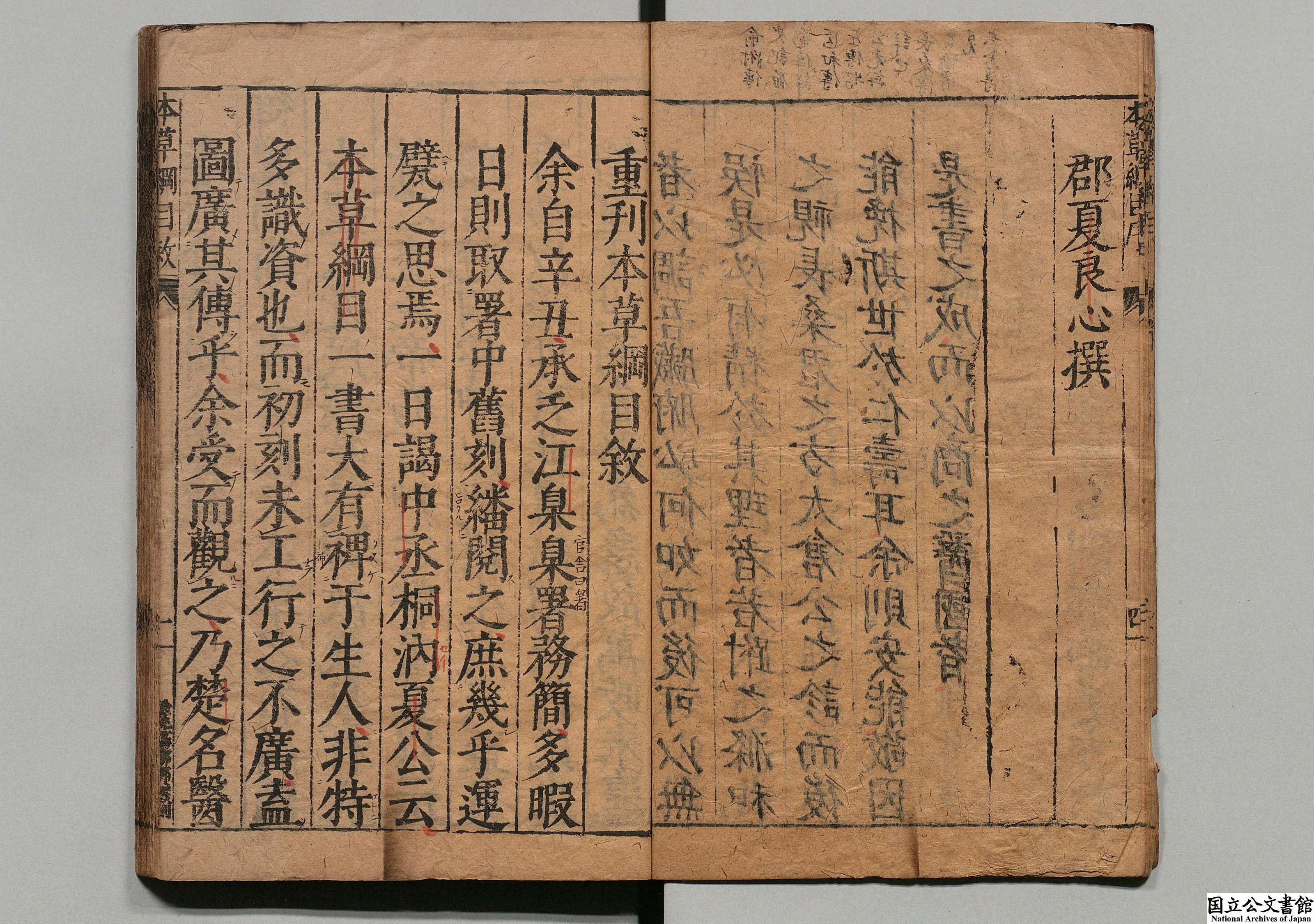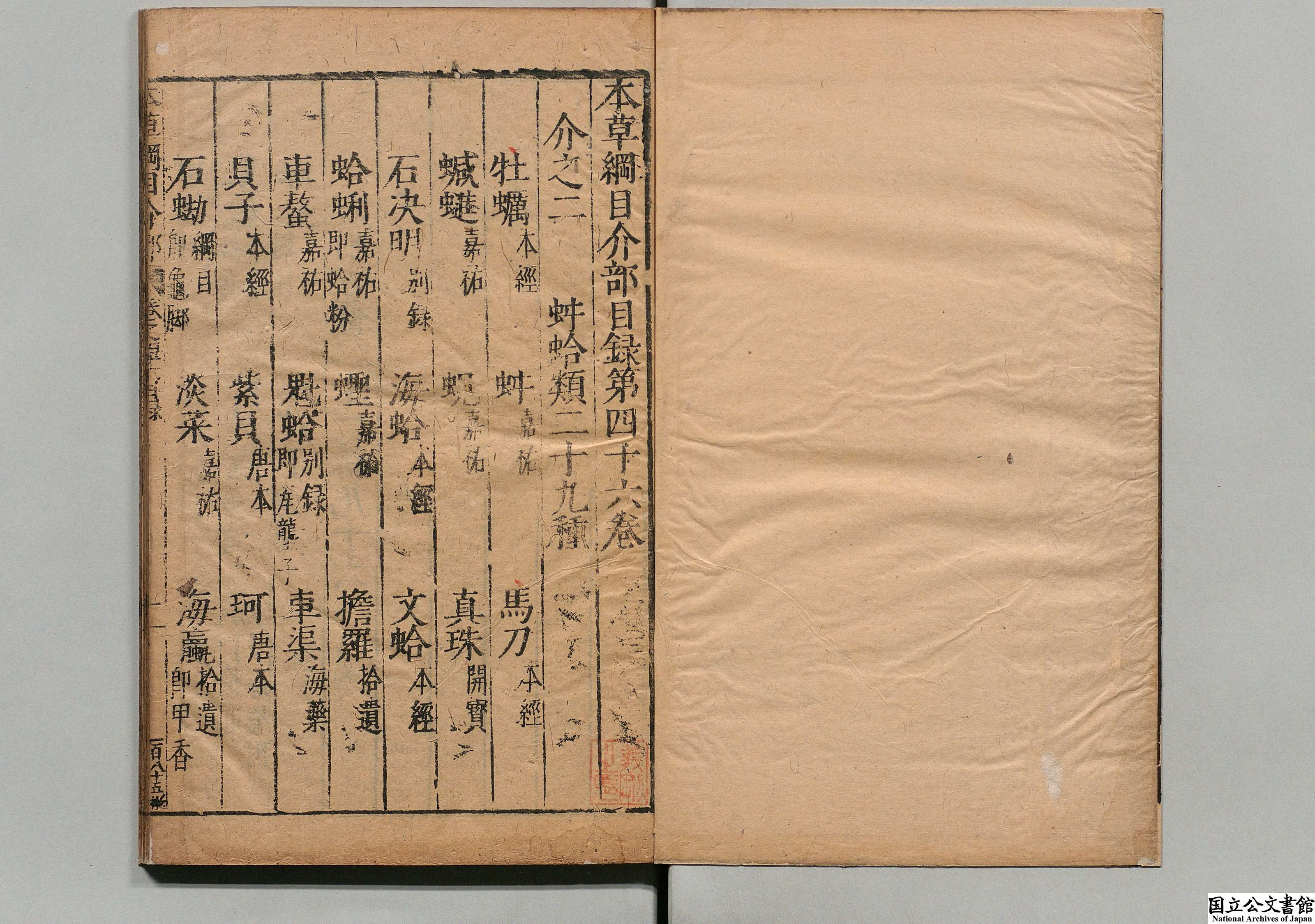 本草纲目 全52卷 另含:图2卷 奇经八脉考 脉学 脉诀考证各1卷 明·李时珍编著 明万历31年 (1603年) 江西本刻本 高积山释迦文院旧藏 日本内阁文库数字化