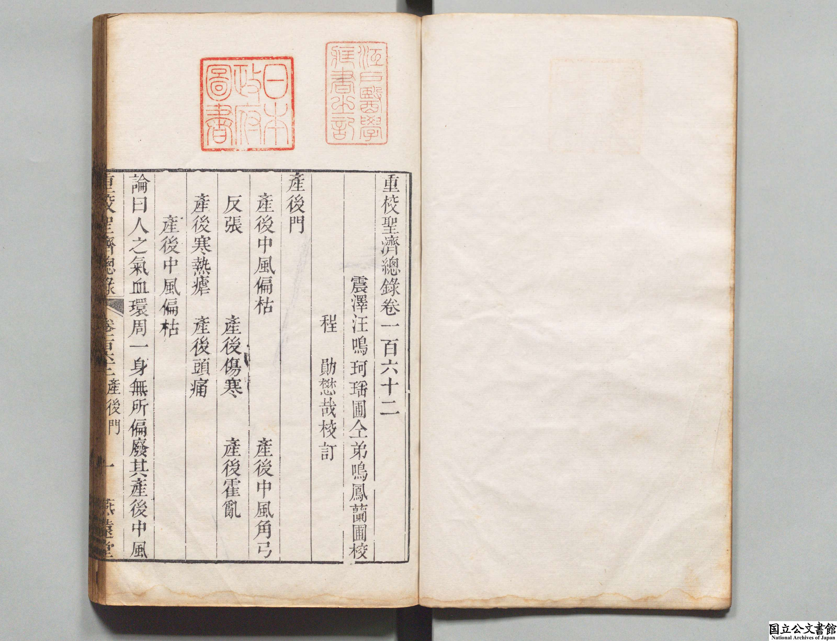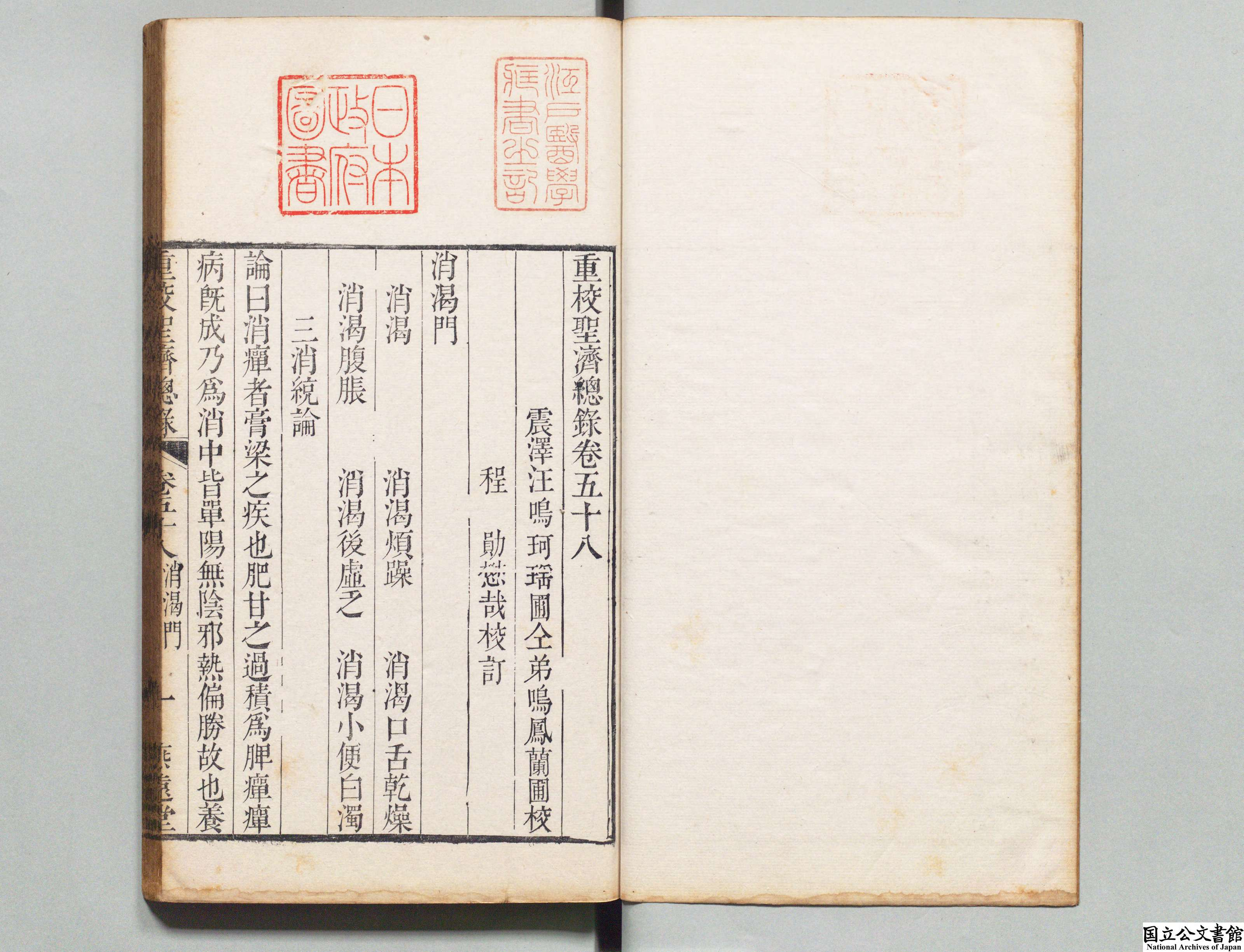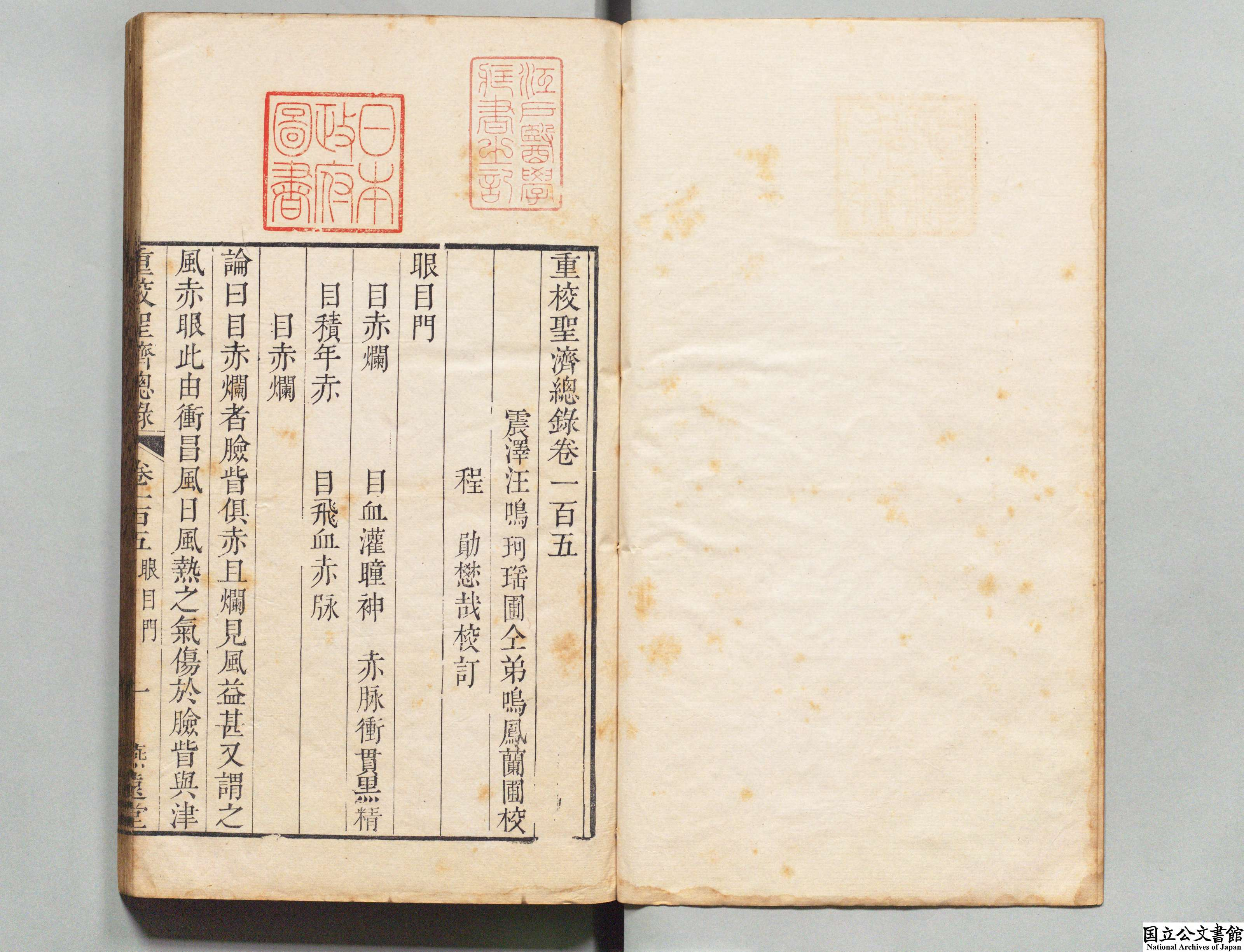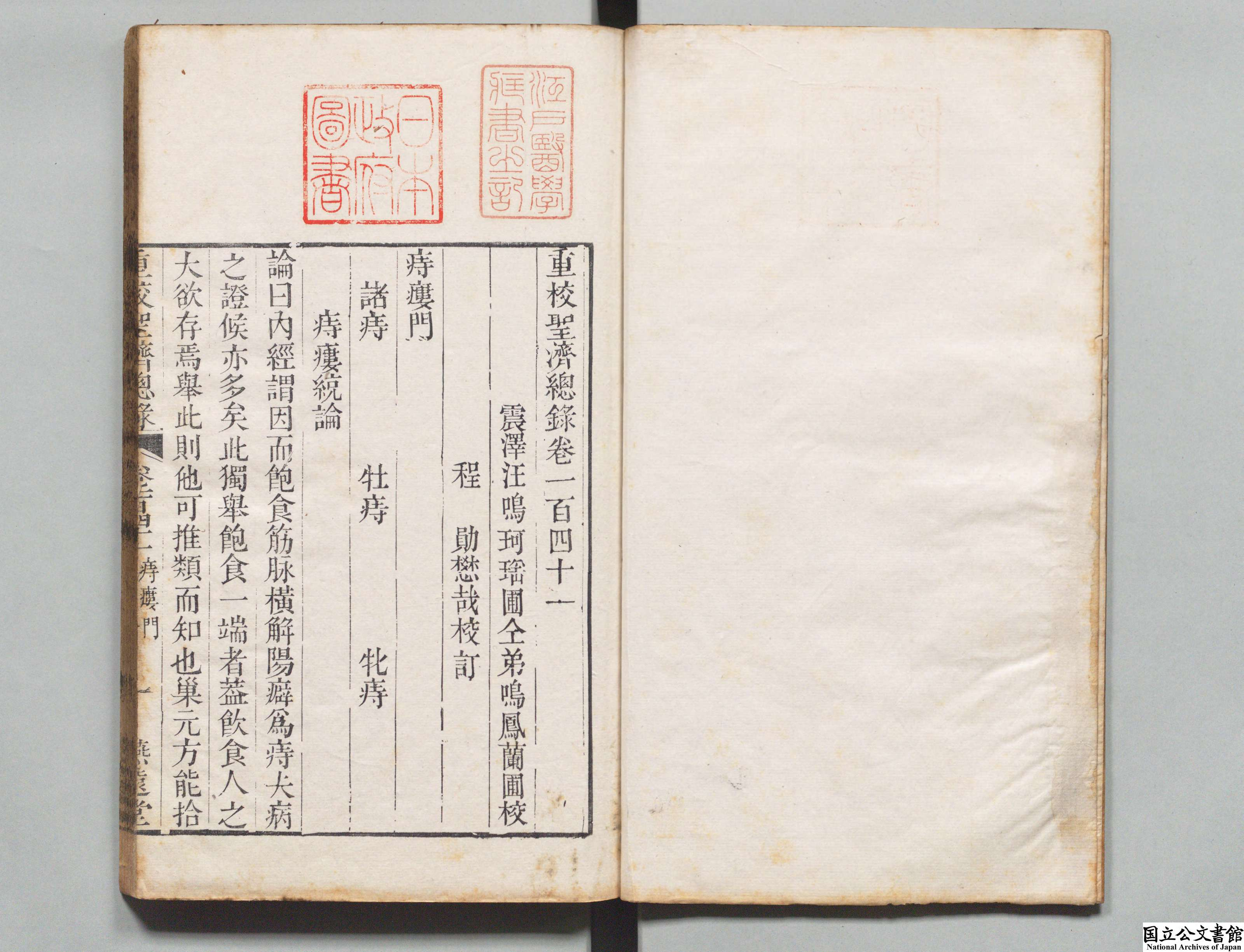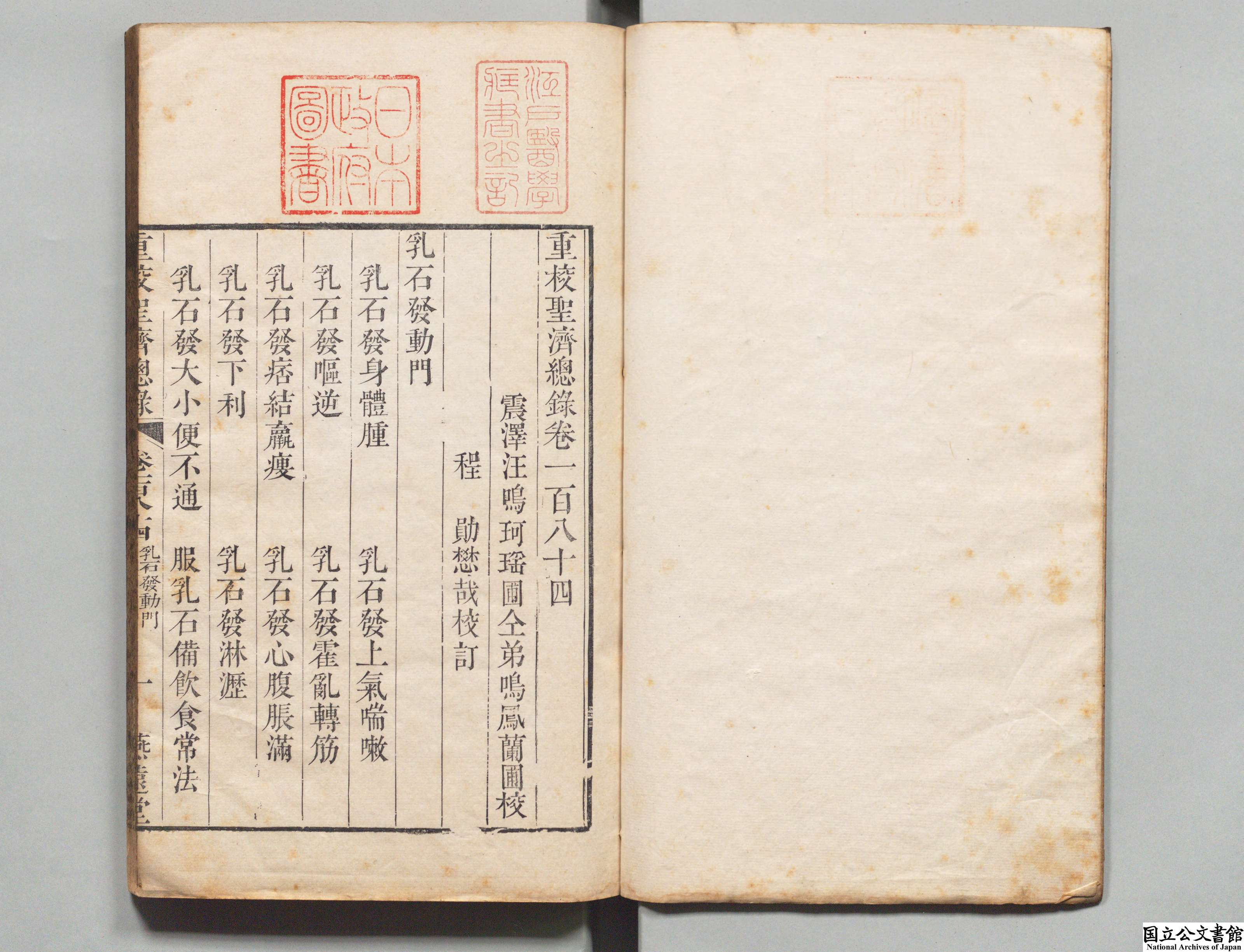 重校圣济总录 全201卷 有缺 宋徽宗赵佶敕编 清·汪鸣珂校订 清乾隆54年 (1789年) 平川燕远堂刻本 江户医学馆旧藏 日本内阁文库数字化