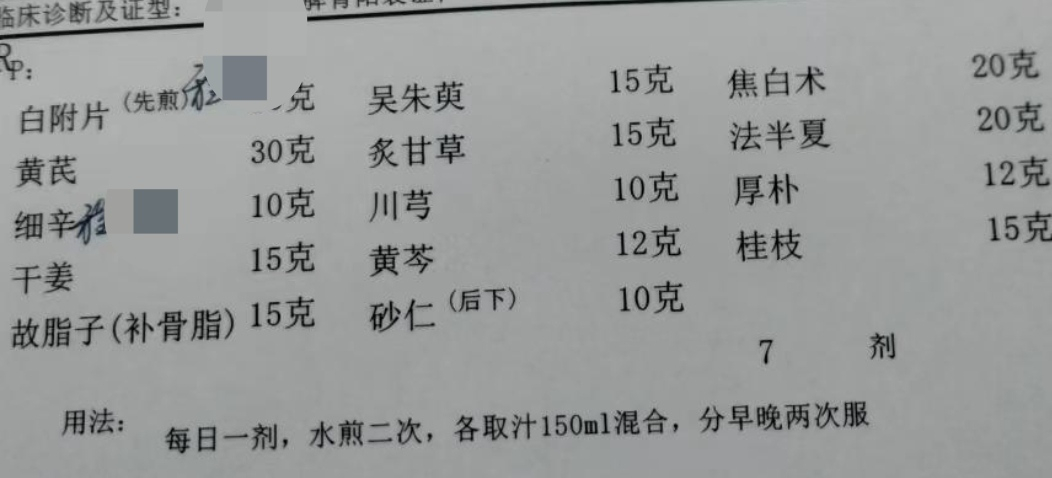 下图是第二次药方,当时也和医生说了 以前用了高良姜,旋覆花,吴茱萸,白胡椒,川穹,牛膝,桂枝,当归,肉桂等自己感觉好过一点,医生可能然后就按这个思路开了药方。