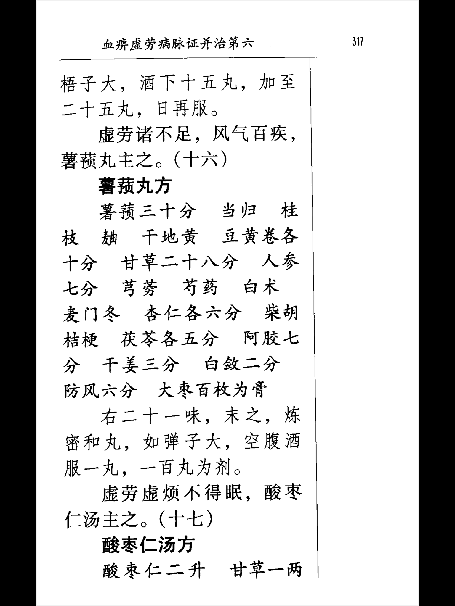 【组成】薯蓣(山药)9克,当归3克,桂枝3克,曲3克,干地黄3克,大豆黄卷3克,甘草6克,人参2.1克,川芎1.8克,芍药1.8克,白朮1.8克,麦冬1.8克,杏仁1.8克,柴胡1.5克,桔梗1.5克,茯苓1.5克, 阿胶2.1克,干姜0.9克,白蔹0.6克, 防风1.8克,大枣100枚 (为膏),蜜丸(大枣当为10枚)