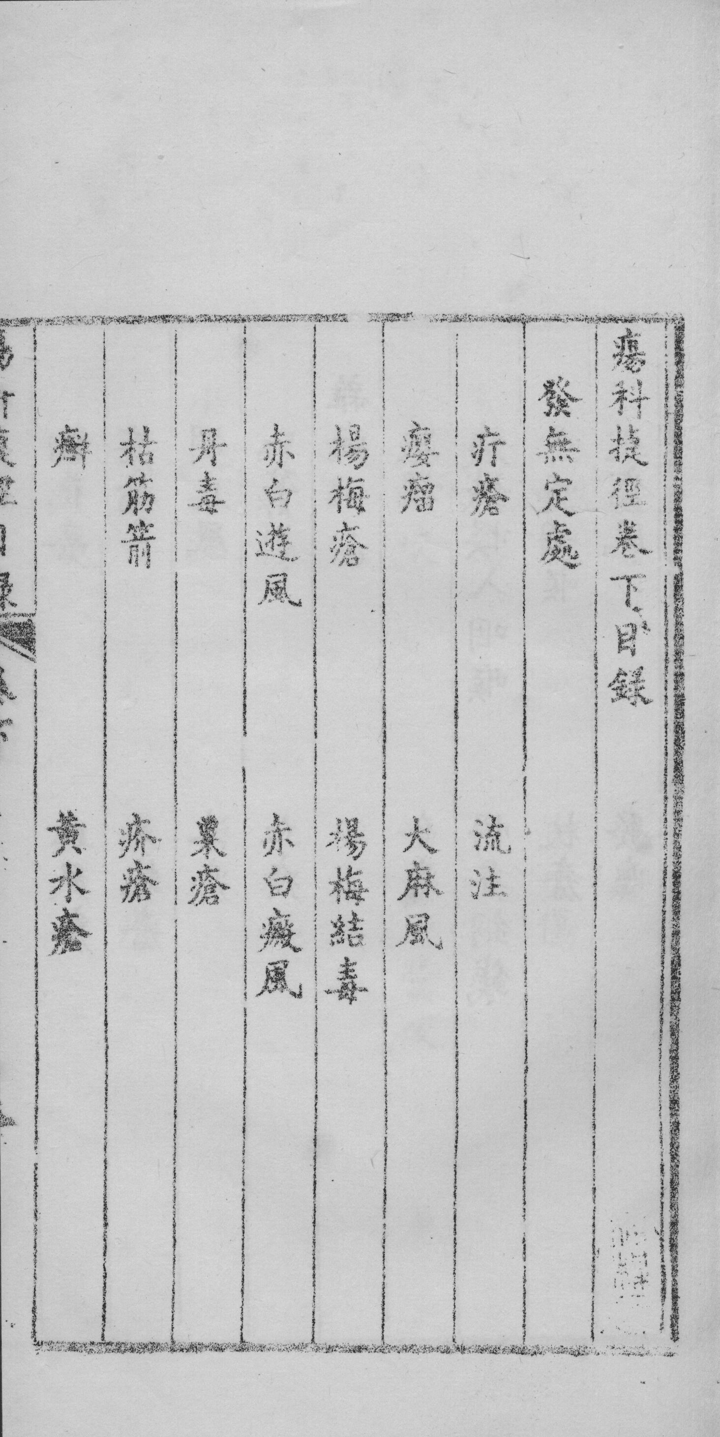 上卷有头、面、项、背、腰、眼、鼻、耳、口、唇、齿等11部,中卷有舌、喉、胸、乳、腹、腋、肋、脏腑、肩、?、臂、手、下阴、臀、股、膝、胫、足等18部。下卷收载发无定处病症(包括外伤杂症)及小儿杂症,约50余症。全书共载外科常见病症210余种,均用歌括写成,方药亦附方歌,言简意赅,便于记诵,兼有十二经起止图、正面和背面疮疡图等,尤宜初学者习读,实为疡科普及范本,堪称疡科入门之捷径。