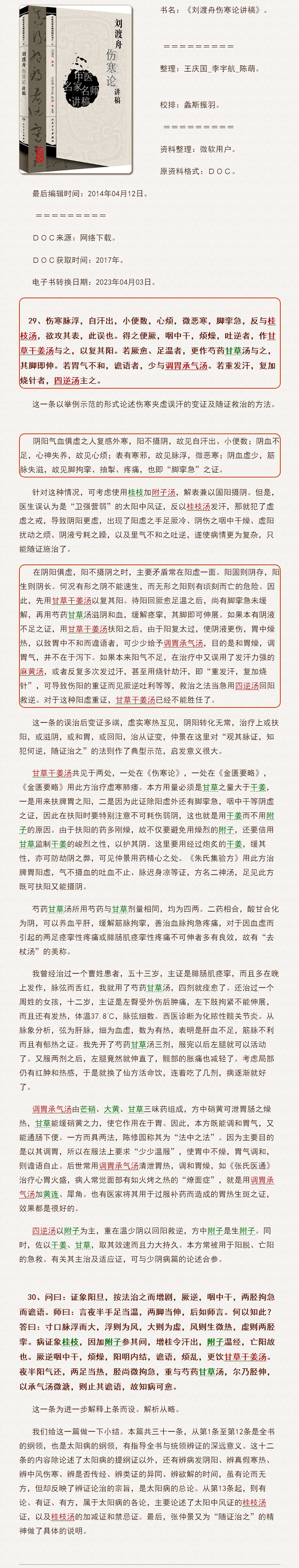 左边条文在“反服桂枝汤”前,跟右边条文一样是个桂枝加附子汤证,而且程度更轻一些,却反服用了桂枝汤,就变成了需要甘草干姜汤救急的阴证。如果不重视附子,用上了炮制得成渣渣的附子而不是“鲜品附子+沙炒”的去皮炮附子,那遇到这桂枝加附子汤的患者,用上了桂枝加渣附子汤,那也相当于服用了桂枝汤,也会“反服桂枝汤”而导致成了阴证。如果变得更严重的话,就得用四逆辈了。但,很可惜,阴证患者,几乎都是要用去皮生附子,那没办法了,患者直接就死了。