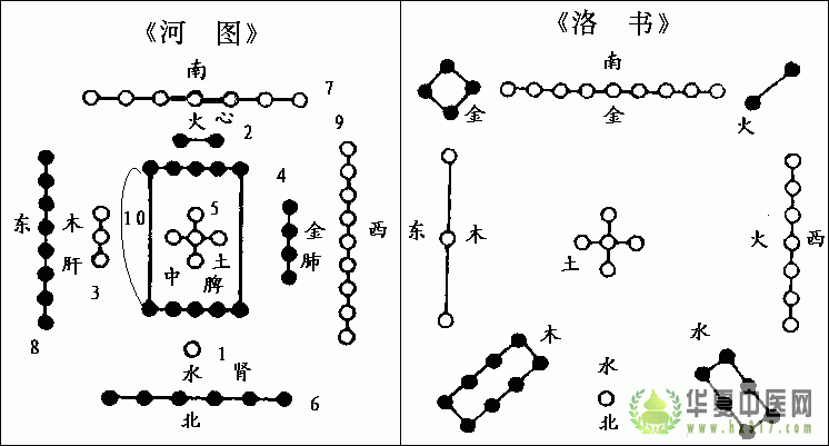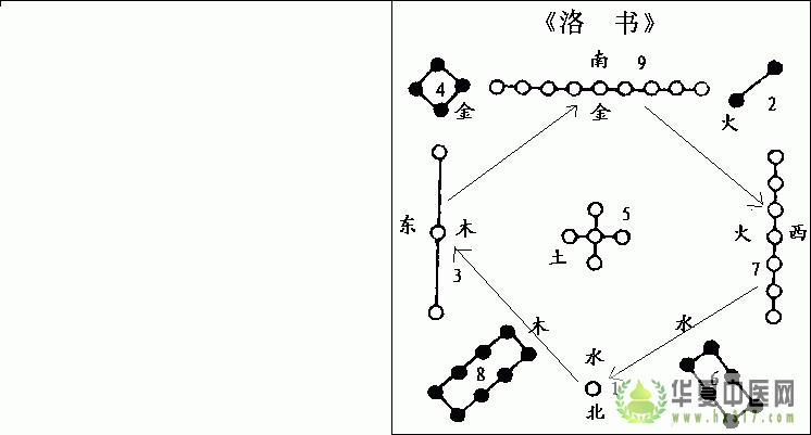 《河图》数:圣人用数字表示水、火、土、金、木五行的生、成。其生数为水一,火二,木三,金四,土五,为什么这麽相配?《尚书·洪范》云:“五行:一曰水,二曰火,三曰木,四曰金,五曰土。”五行非土不成,这些生数只是孤阴或孤阳,必须加上土的生数五,才能起生化作用。八,木的成数;七,火的成数;九,金的成数;六,水的成数。“天一生水,地六成之”等就是这个意思。白色圆圈点,天数、阳数、奇数,“天一”是也;黑色圆圈点,地数、阴数、偶数,“地六”是也。