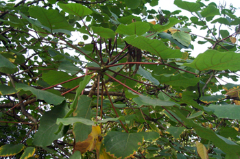 [植物形态] 多年生大型蕨类植物,高2~3m。根茎粗大,直立或平卧,密被金黄长茸毛,顶端有丛生。叶柄粗,自根茎抽出,长约120cm,叶片革质,叶宽卵状三角形,三回羽裂,末回裂片镰状披针形,长1~1.4cm,宽约3mm,尖头,边缘有浅锯齿,侧脉单一,或在不育裂片上为二叉。孢子囊群生于小脉顶端,每裂片上1~5对;囊群盖两瓣,成熟时张开如蚌壳。