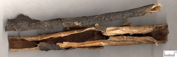 [药材性状] 呈不规则的长块状,长10~30cm,直径2~10cm。表面深棕色,残留金黄色绒毛;上面有数个红棕色的木质叶柄,下面残存黑色细根。质坚硬,不易折断。无臭,味淡、微涩。生狗脊片呈不规则长条形或圆形,长5~20cm,直径2~10cm,厚1.5~5mm;切面浅棕色,较平滑,近边缘1~4mm处有条棕黄色隆起的木质部环纹或条纹,边缘不整齐,偶有金黄色绒毛残留;质脆,易折断,有粉性。熟狗脊片呈黑棕色,质坚硬。