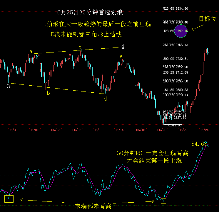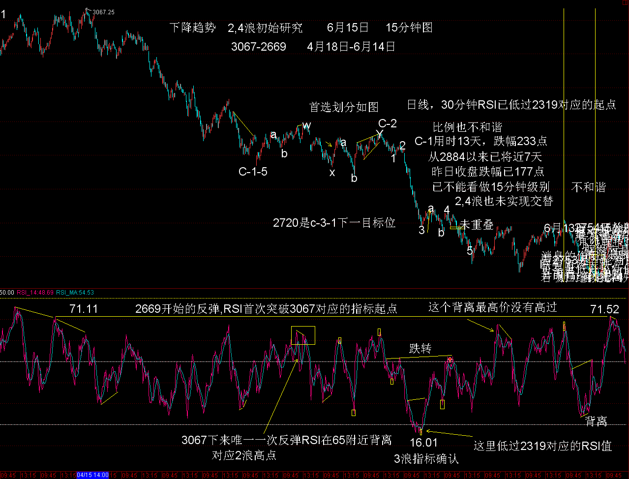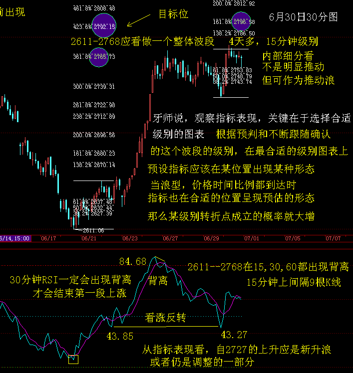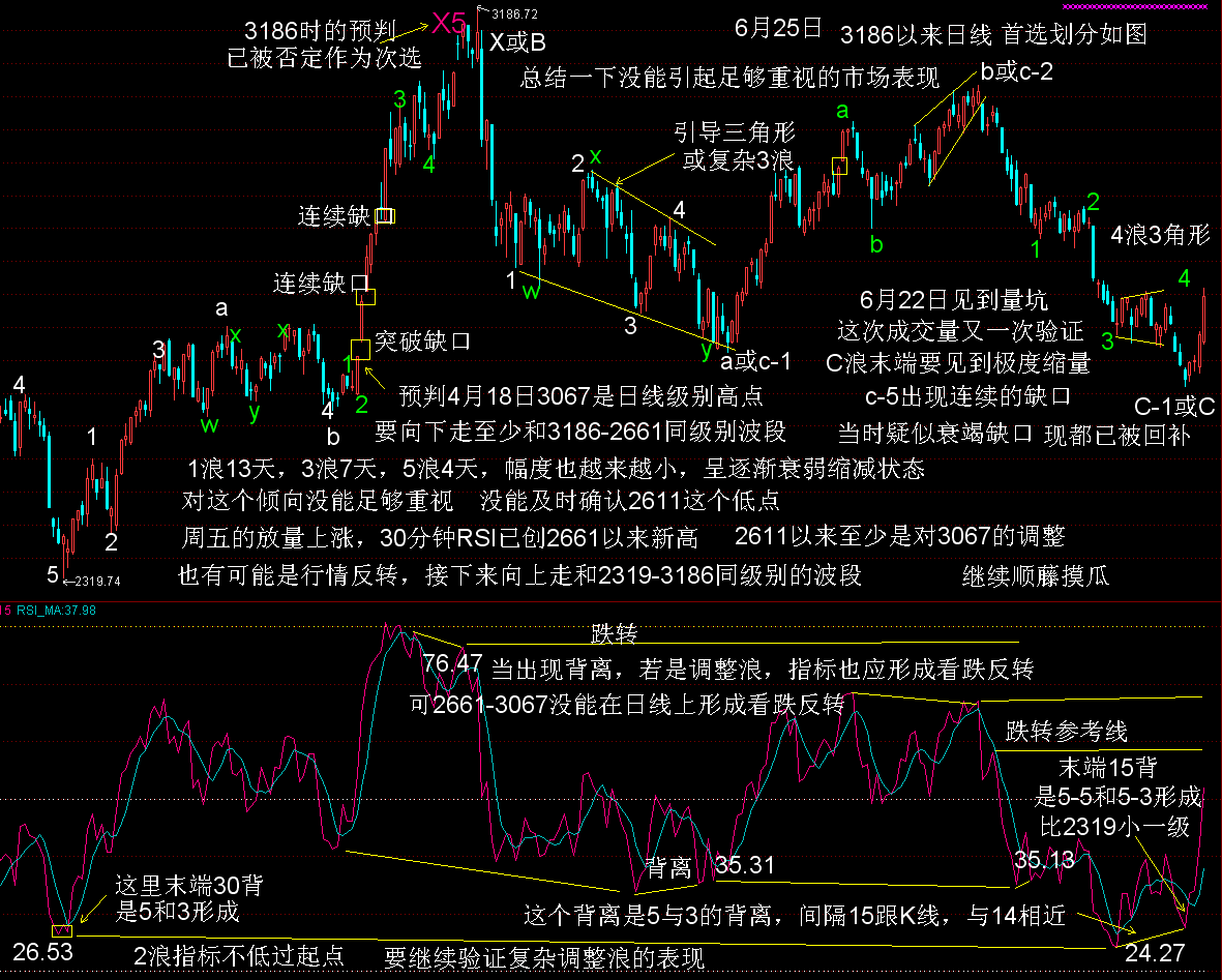 首先,牙师说过,推动浪在本级别背离,30推,应见到30背,比如2319-3186运行87天,虽说牙师的时间划分没有日级别,但应确认为日线级别,它的指标表现正是日线上80高位背离,这也是我次选仍把它作为5浪延长的日级别推动的,一个重要原因。另外,事实是目前15,30 RSI都已运行到远高于80的位置,大概率来讲,这么强劲的趋势,必然要背离,或说减速后才会结束。看目前浪形运行节奏,经验上判断,15背是必然的,甚至有可能2次背离,30上也应有一背