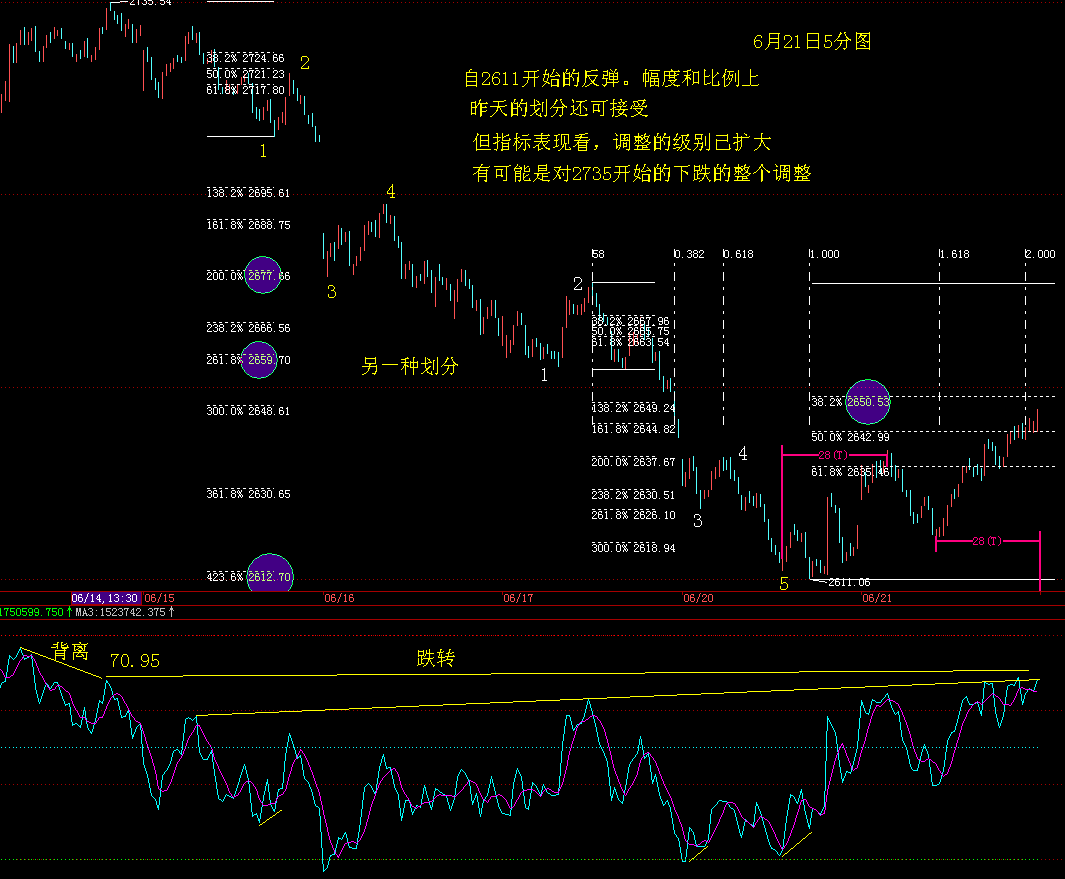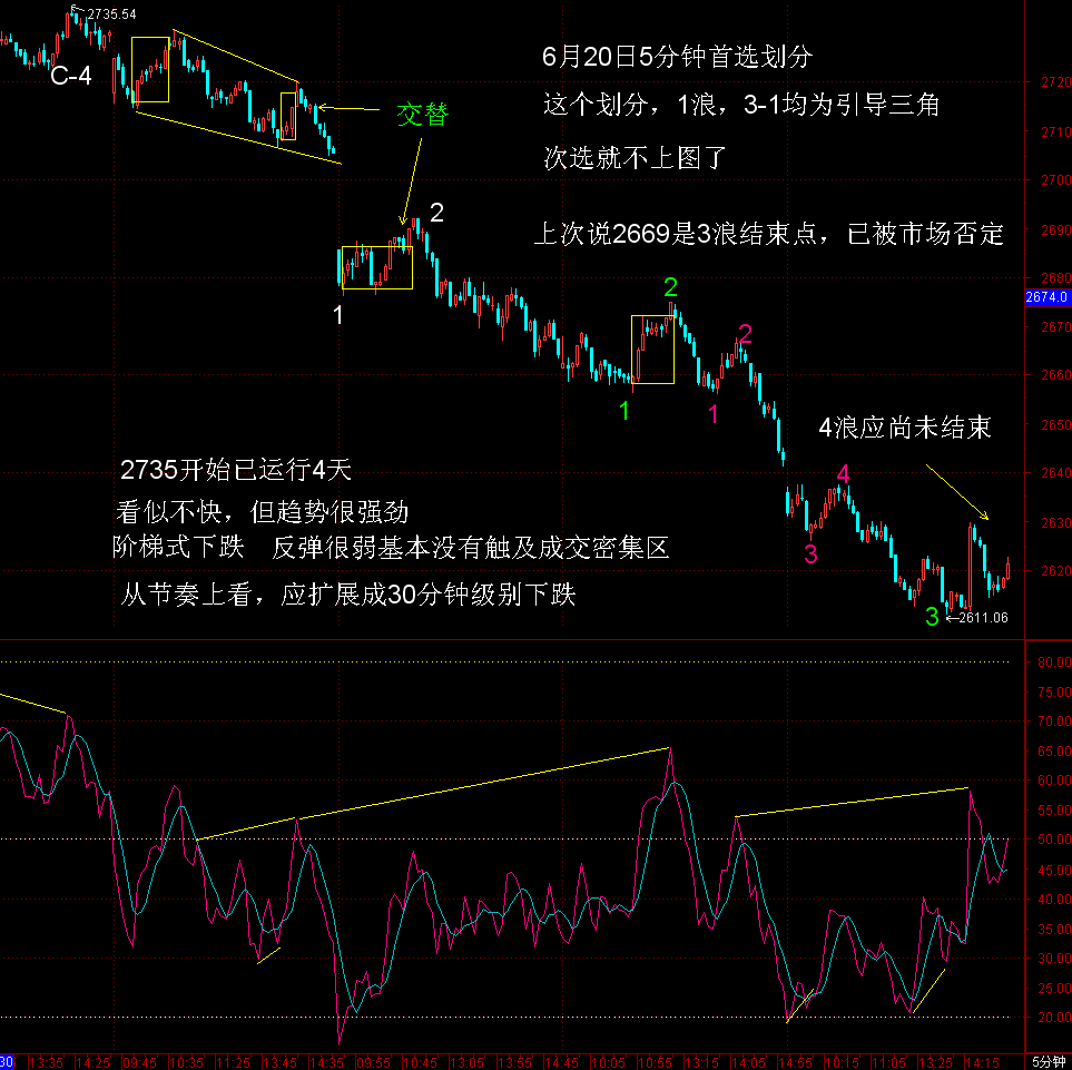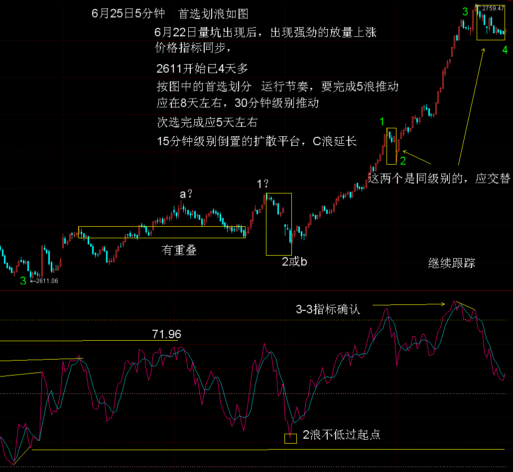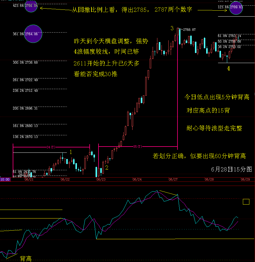 L laoluns 声名鹊起 正式会员 注册 2011/01/04 帖子 163 获得点赞 0 声望 0 年龄 53 2011/06/26 #272 首先,牙师说过,推动浪在本级别背离,30推,应见到30背,比如2319-3186运行87天,虽说牙师的时间划分没有日级别,但应确认为日线级别,它的指标表现正是日线上80高位背离,这也是我次选仍把它作为5浪延长的日级别推动的,一个重要原因。另外,事实是目前15,30 RSI都已运行到远高于80的位置,大概率来讲,这么强劲的趋势,必然要背离,或说减速后才会结束。看目前浪形运行节奏,经验上判断,15背是必然的,甚至有可能2次背离,30上也应有一背